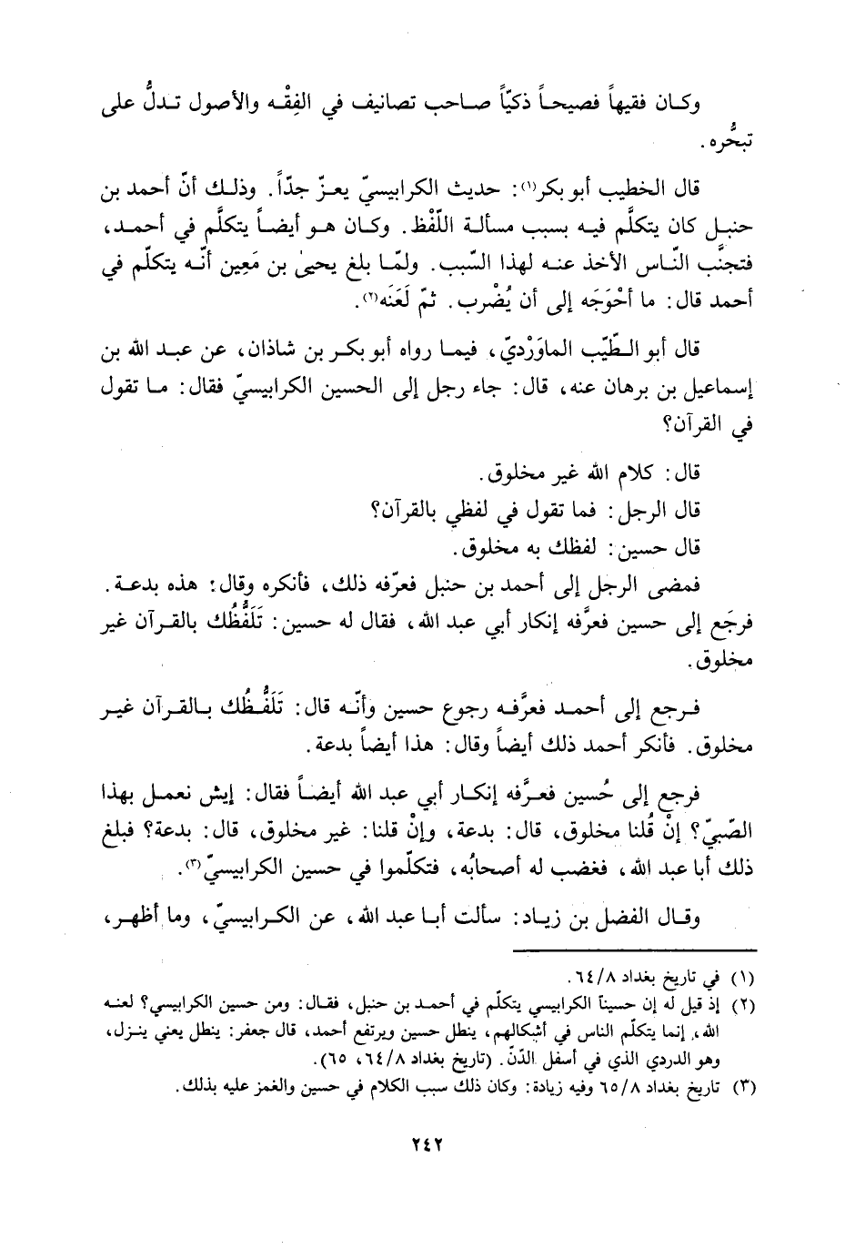 فرجع إلى حُسَيْنِ فعرَّفه إنكار أبي عبد الله، فقال له حُسَيْنِ: تَلَفُّظُك بالقرآن غير مخلوق.