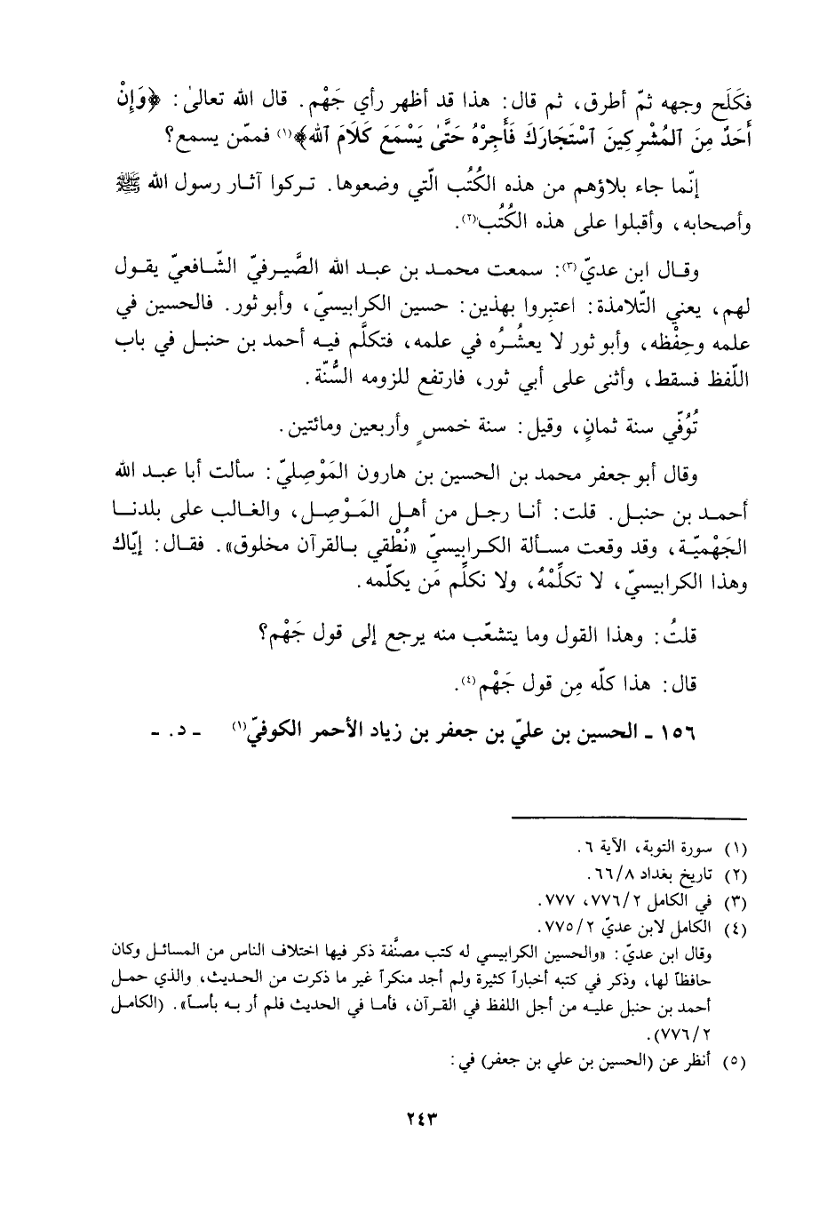 وقال أبو جَعْفَر محمد بْن الْحُسَيْن بْن هارون المَوْصِليّ: سَأَلت أَبَا عبد الله أحمد بْن حنبل. قلت: أَنَا رَجُل من أهلِ المَوْصلِ، والغالب على بلدنا الْجَهْميّة، وقد وقعت مسألة الكرابيسيّ «نُطْقي بالقرآن مخلوق» . فقال: إيّاك وهذا الكرابيسيّ، لا تكلِّمْهُ، ولا نكلِّمُ مَنْ يكلّمه.
