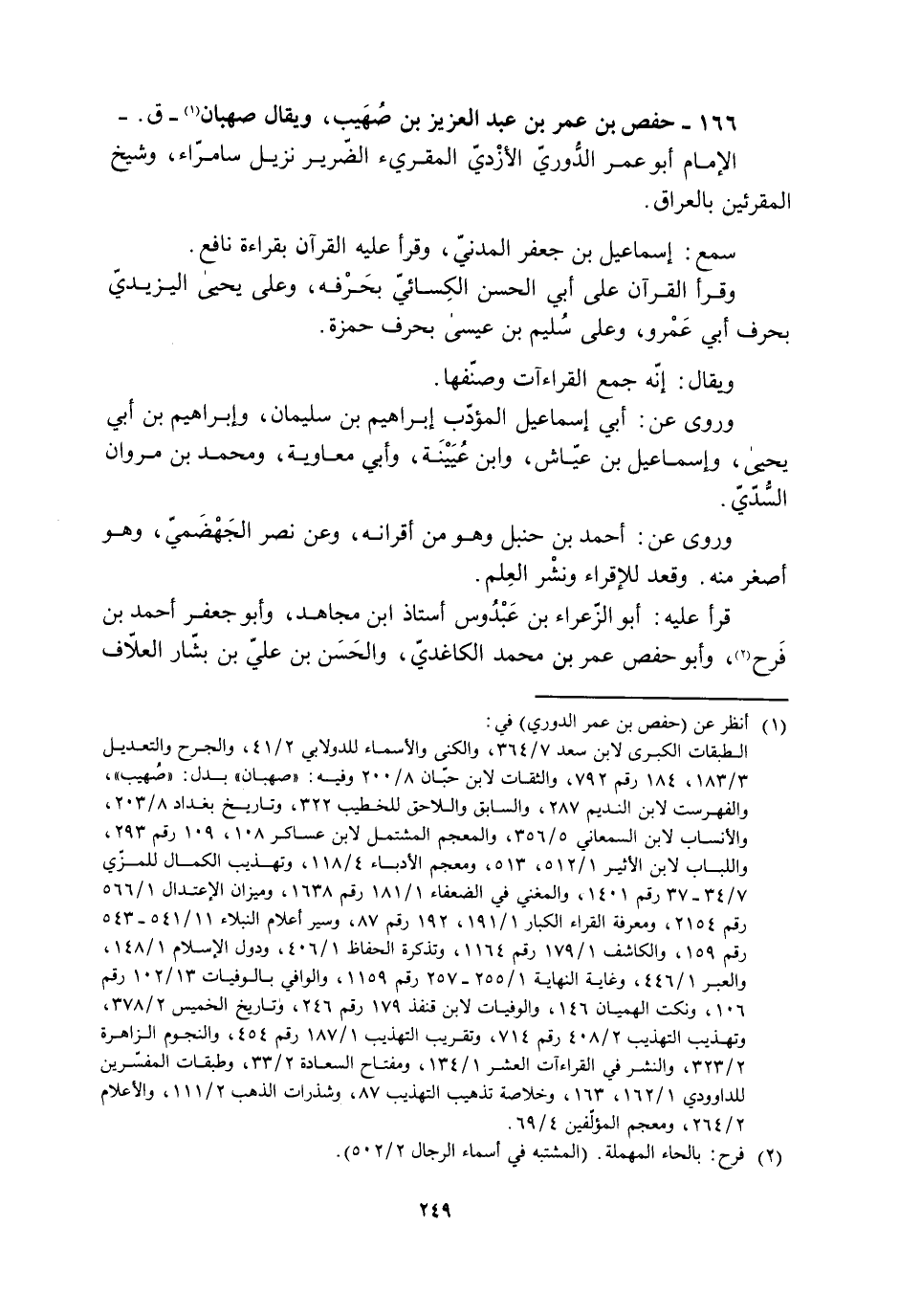166- حفص بن عمر بن عبد العزيز بن صهيب، ويقال صهبان [1]- ق. - الإمام أبو عمر الدّوريّ الأزديّ المقرئ الضّرير نزيل سامرّاء، وشيخ المقرءين بالعراق.