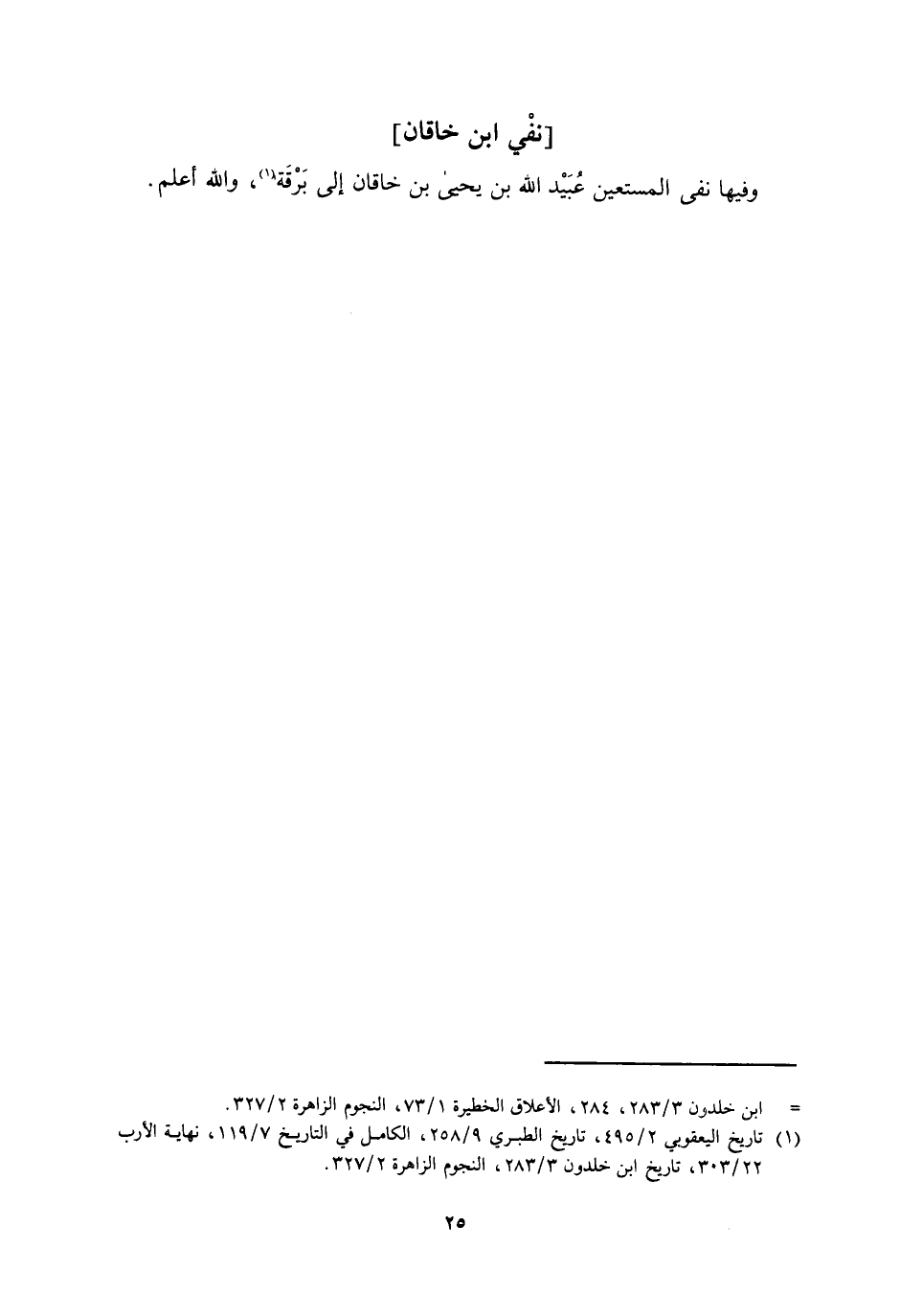 [1] تاريخ اليعقوبي 2/ 495، تاريخ الطبري 9/ 258، الكامل في التاريخ 7/ 119، نهاية الأرب 22/ 303، تاريخ ابن خلدون 3/ 283، النجوم الزاهرة 2/ 327.