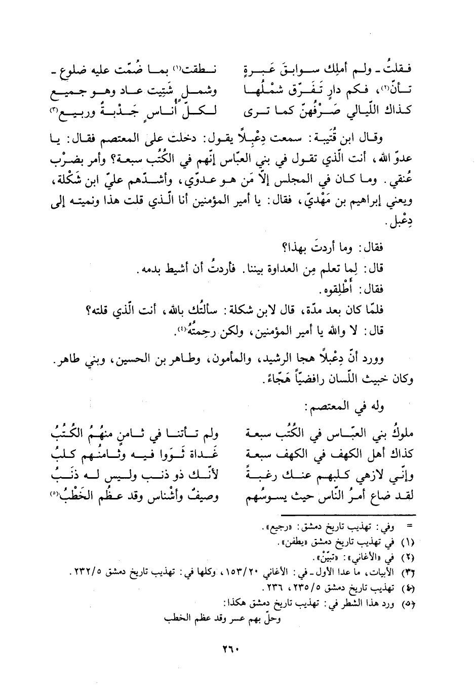 وقال ابن قُتَيْبَةَ: سمعت دِعْبِلا يقول: دخلت على المعتصم فقال: يا عدوّ اللَّه، أنت الَّذِي تقول فِي بني الْعَبَّاس إنهم فِي الكُتُب سبعة؟ وأمر بضربُ عُنقي. وما كان فِي المجلس إلا مَن هُوَ عدوّي، وأشدّهم عليّ ابن شَكْلة، ويعني إبراهيم بْن مَهْديّ، فقال: يا أمير المؤمنين أَنَا الَّذِي قلت هذا ونميته إلى دِعْبل.