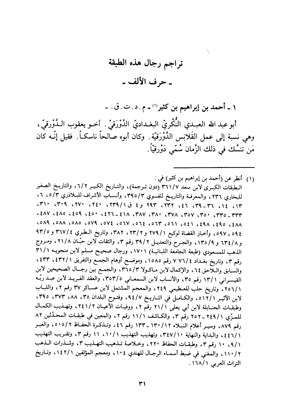 1- أَحْمَد بْن إِبْرَاهِيم بن كثير [1]- م. د. ت. ق. - أبو عبد الله العبدي النُّكْريّ البغداديّ الدَّوْرقيّ. أخو يعقوب الدَّوْرقيّ، وهي نسبة إلى عمل القَلانِس الدَّوْرَقيّة. وكان أبوه صالحا ناسكا. فقيل إنّه كان مَن تنسَّك في ذلك الزَّمان سمّي دورقيّا.