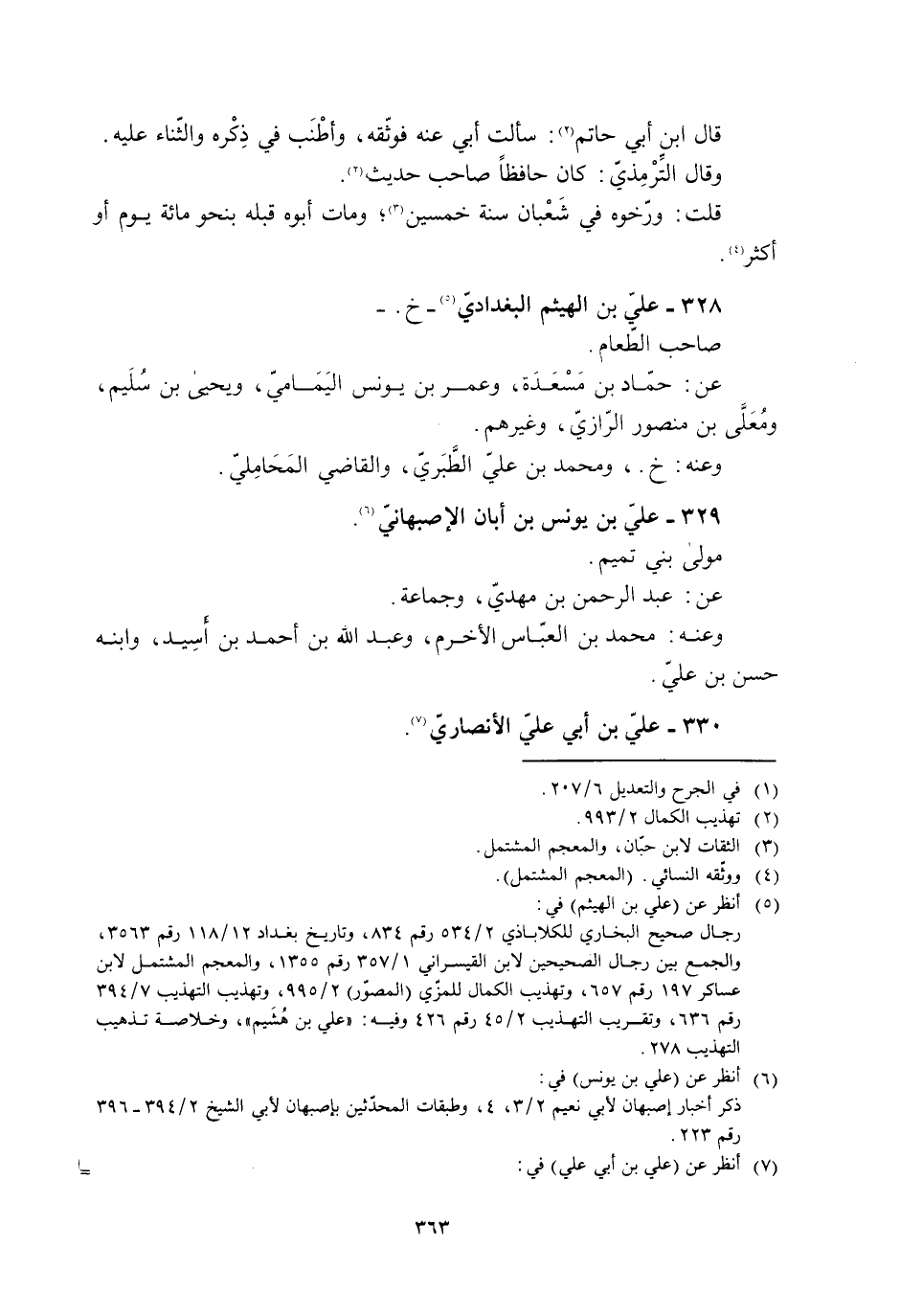 رجال صحيح البخاري للكلاباذي 2/ 534 رقم 834، وتاريخ بغداد 12/ 118 رقم 3563، والجمع بين رجال الصحيحين لابن القيسراني 1/ 357 رقم 1355، والمعجم المشتمل لابن عساكر 197 رقم 657، وتهذيب الكمال للمزّي (المصوّر) 2/ 995، وتهذيب التهذيب 7/ 394 رقم 636، وتقريب التهذيب 2/ 45 رقم 426، وفيه: «علي بن هشيم» ، وخلاصة تذهيب التهذيب 278.