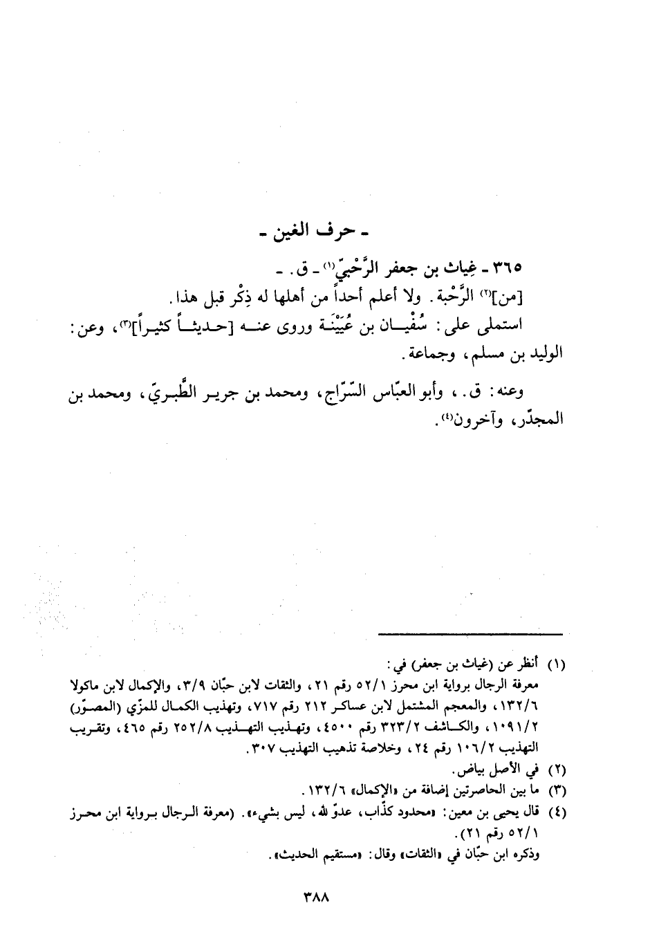 365- غِياث بن جعفر الرَّحْبيّ [1]- ق. -[من] [2] الرَّحْبة. ولا أعلم أحدا من أهلها له ذِكْر قبل هذا.