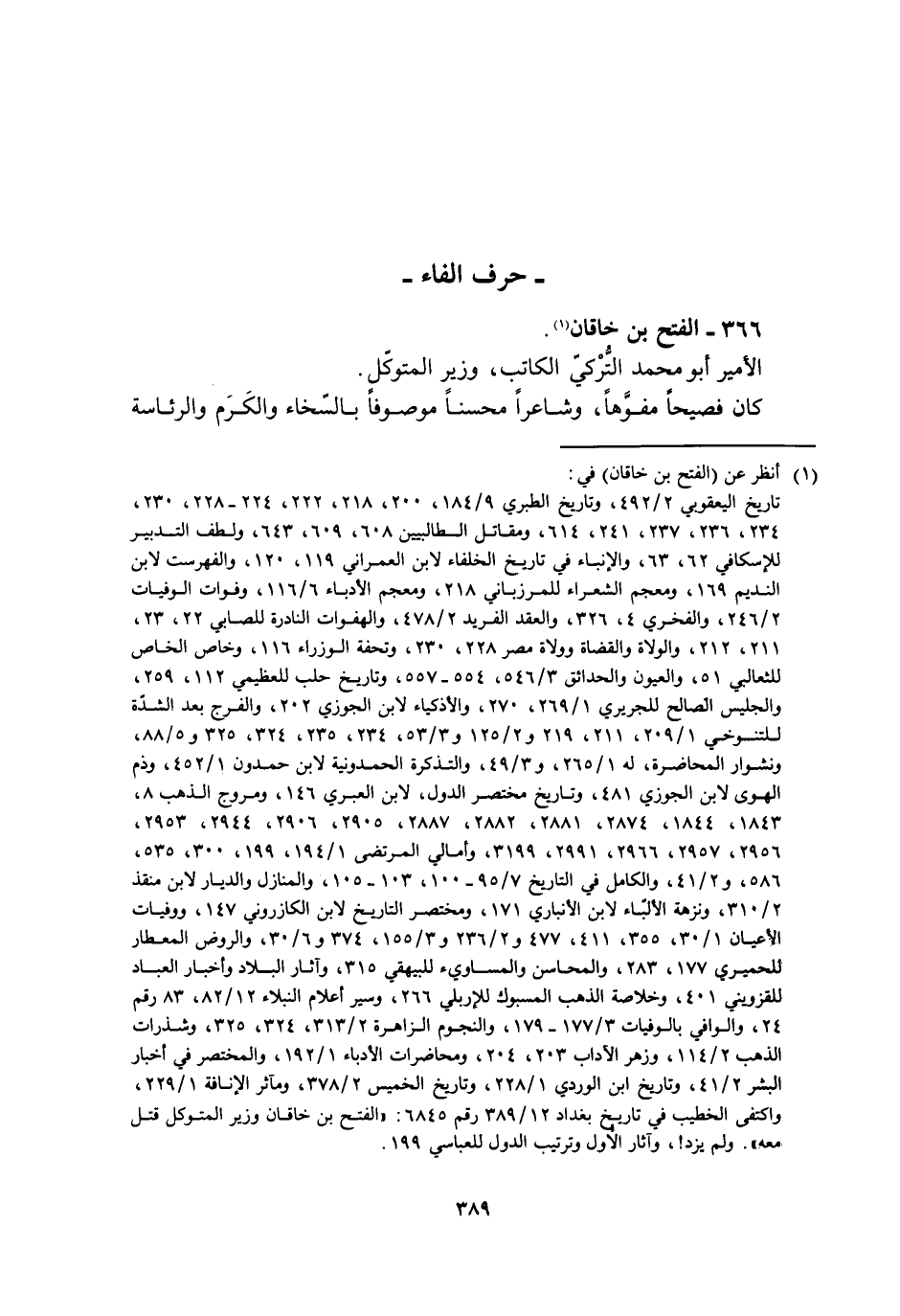 تاريخ اليعقوبي 2/ 492، وتاريخ الطبري 9/ 184، 200، 218، 222، 224- 228، 230، 234، 236، 237، 241، 614، ومقاتل الطالبيين 608، 609، 643، ولطف التدبير للإسكافي 62، 63، والإنباء في تاريخ الخلفاء لابن العمراني 119، 120، والفهرست لابن النديم 169، ومعجم الشعراء للمرزباني 218، ومعجم الأدباء 6/ 116، وفوات الوفيات 2/ 246، والفخري 4، 326، والعقد الفريد 2/ 478، والهفوات النادرة للصابي 22، 23، 211، 212، والولاة والقضاة وولاة مصر 228، 230، وتحفة الوزراء 116، وخاص الخاص للثعالبي 51، والعيون والحدائق 3/ 546، 554- 557، وتاريخ حلب للعظيميّ 112، 259، والجليس الصالح للجريري 1/ 269، 270، والأذكياء لابن الجوزي 202، والفرج بعد الشدّة للتنوخي 1/ 209، 211، 219 و 2/ 125 و 3/ 53، 234، 235، 324، 325 و 5/ 88، ونشوار المحاضرة، له 1/ 265، و 3/ 49، والتذكرة الحمدونية لابن حمدون 1/ 452، وذم الهوى لابن الجوزي 481، وتاريخ مختصر الدول، لابن العبري 146، ومروج الذهب 8، 1843، 1844، 2874، 2881، 2882، 2887، 2905، 2906، 2944، 2953، 2956، 2957، 2966، 2991، 3199، وأمالي المرتضى 1/ 194، 199، 300، 535، 586، و 2/ 41، والكامل في التاريخ 7/ 95- 100، 103- 105، والمنازل والديار لابن منقذ 2/ 310، ونزهة الألبّاء لابن الأنباري 171، ومختصر التاريخ لابن الكازروني 147، ووفيات الأعيان 1/ 30، 355، 411، 477 و 2/ 236 و 3/ 155، 374 و 6/ 30، والروض المعطار للحميري 177، 283، والمحاسن والمساوئ للبيهقي 315، وآثار البلاد وأخبار العباد للقزويني 401، وخلاصة الذهب المسبوك للإربلي 266، وسير أعلام النبلاء 12/ 82، 83 رقم 24، والوافي بالوفيات 3/ 177- 179، والنجوم الزاهرة 2/ 313، 324، 325، وشذرات الذهب 2/ 114، وزهر الآداب 203، 204، ومحاضرات الأدباء 1/ 192، والمختصر في أخبار البشر 2/ 41، وتاريخ ابن الوردي 1/ 228، وتاريخ الخميس 2/ 378، ومآثر الإنافة 1/ 229، واكتفى الخطيب في تاريخ بغداد 12/ 389 رقم 6845: «الفتح بن خاقان وزير المتوكل قتل معه» . ولم يزد!، وآثار الأول وترتيب الدول للعباسي 199.