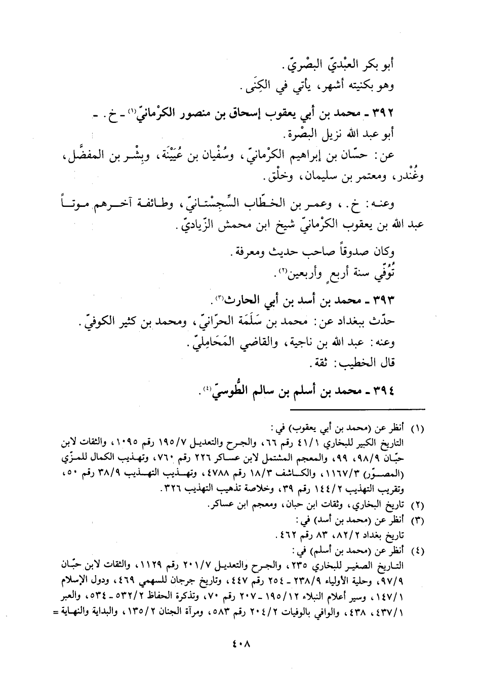 392- محمد بن أبي يعقوب إسحاق بن منصور الكرمانيّ [1]- خ. - أبو عبد الله نزيل البصْرة.