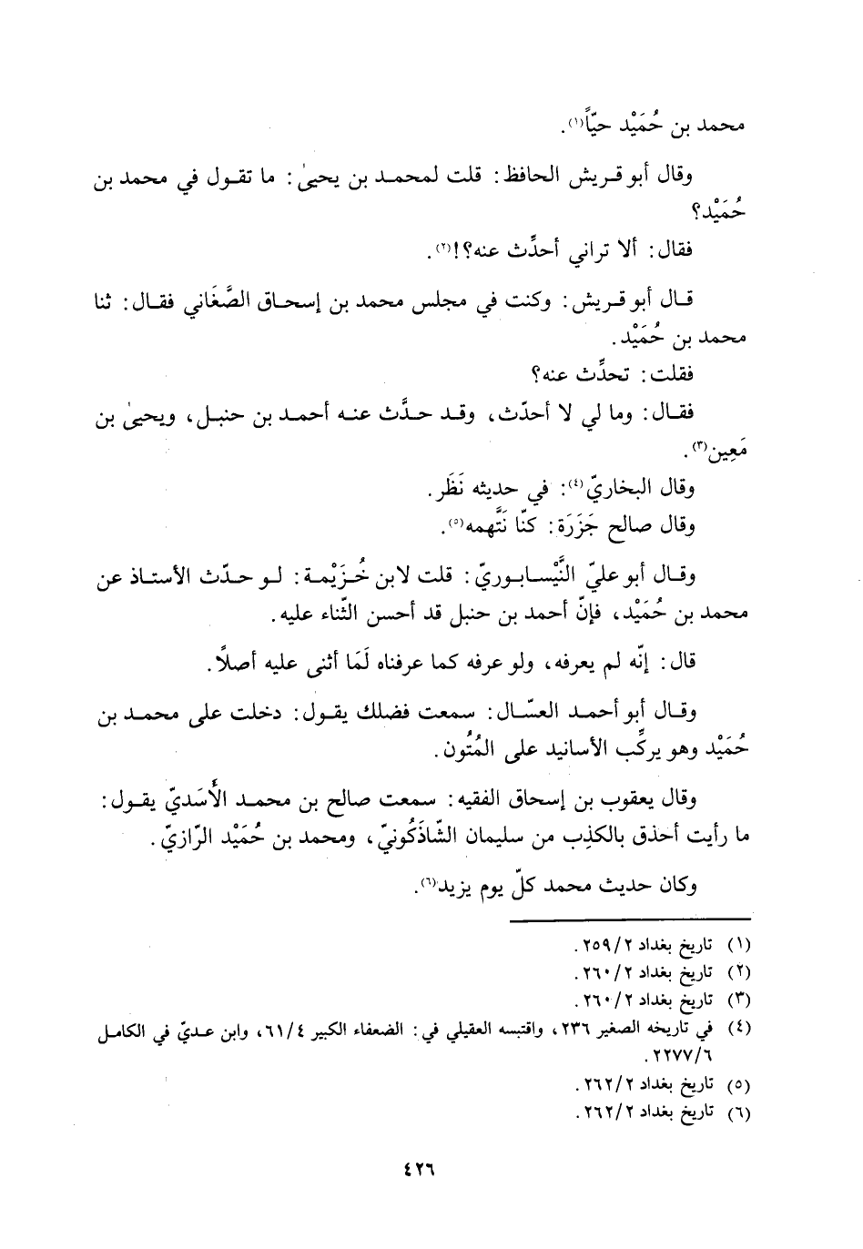 [4] في تاريخه الصغير 236، واقتبسه العقيلي في: الضعفاء الكبير 4/ 61، وابن عديّ في الكامل 6/ 2277.