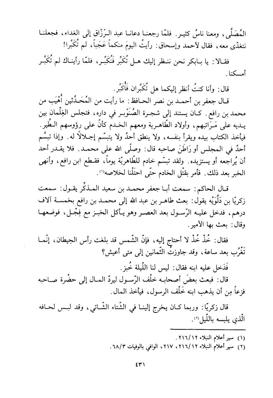 قال الحاكم: سمعت أَبَا جَعْفَر محمد بْن سَعِيد المذِّكر يقول: سمعت زَكَرِيّا بْن دَلَّوَيْهِ يقول: بعث طاهر بْن عبد الله إلى محمد بْن رافع بخمسة آلاف درهم، فدخل عليه الّرسول بعد العصر وهو يأكل الخبز مع فِجْل، فوضعها وقال: بعث بها الأمير.