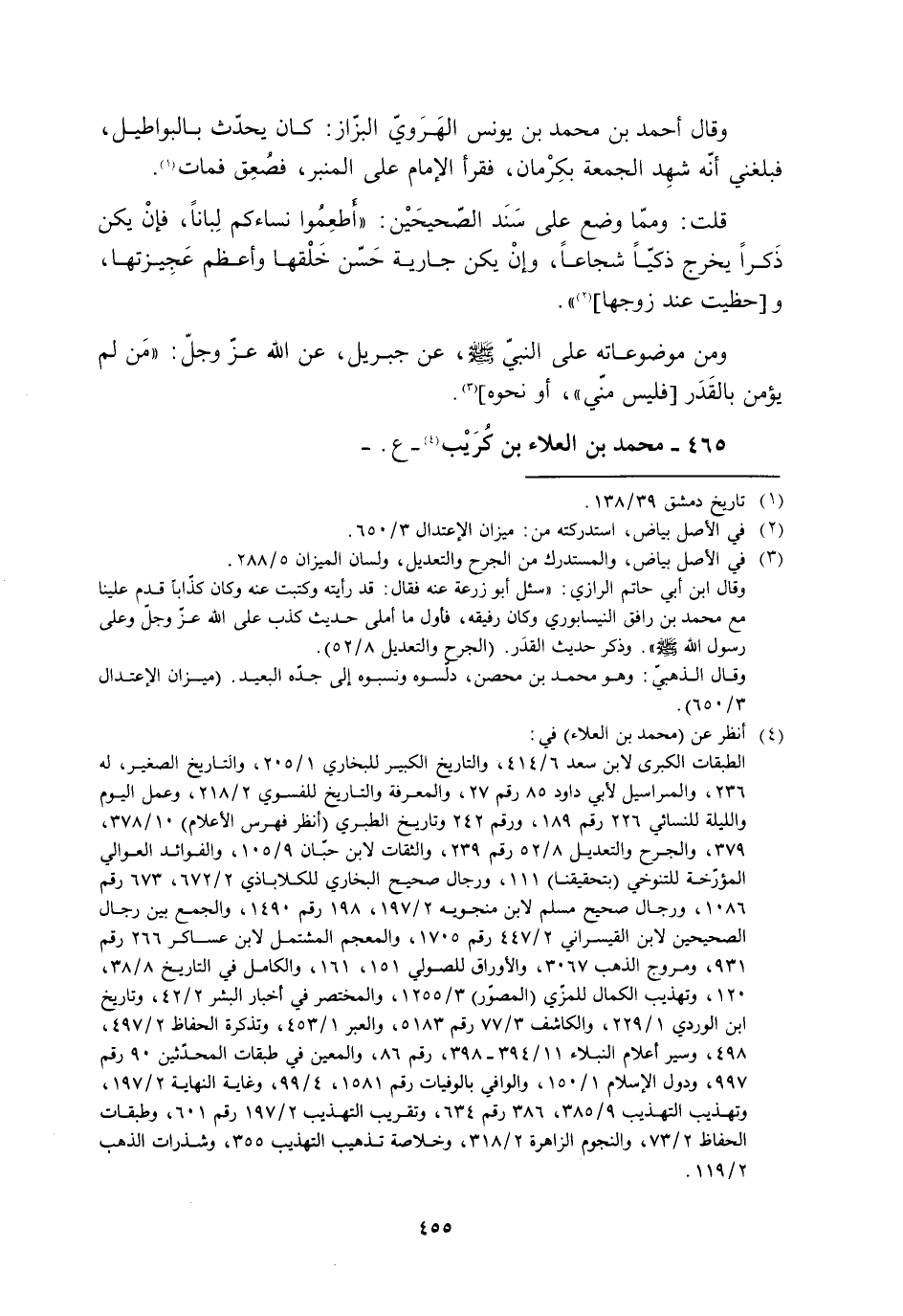 قُلْتُ: وَمِمَّا وَضَعَ عَلَى سَنَدِ الصَّحِيحَيْنِ: «أطعموا نساءكم لبانا، فإن يكن ذكرا يخرج ذَكِيًّا شُجَاعًا، وَإِنْ يَكُنْ جَارِيَةً حَسَّنَ خَلْقَهَا وأعظم عجيزتها، و [حظيت عِنْدَ زَوْجِهَا] [2] » . وَمِنْ مَوْضُوعَاتِهِ عَلَى النَّبِيِّ صَلَّى اللَّهُ عَلَيْهِ وَسَلَّمَ، عَنْ جِبْرِيلَ، عَنِ اللَّهِ عَزَّ وَجَلَّ: «مَنْ لَمْ يُؤْمِنْ بِالْقَدَرِ [فَلَيْسَ مِنِّي» ، أَوْ نَحْوَهُ] [3] . 465- محمد بن العلاء بن كريب [4]- ع. -
