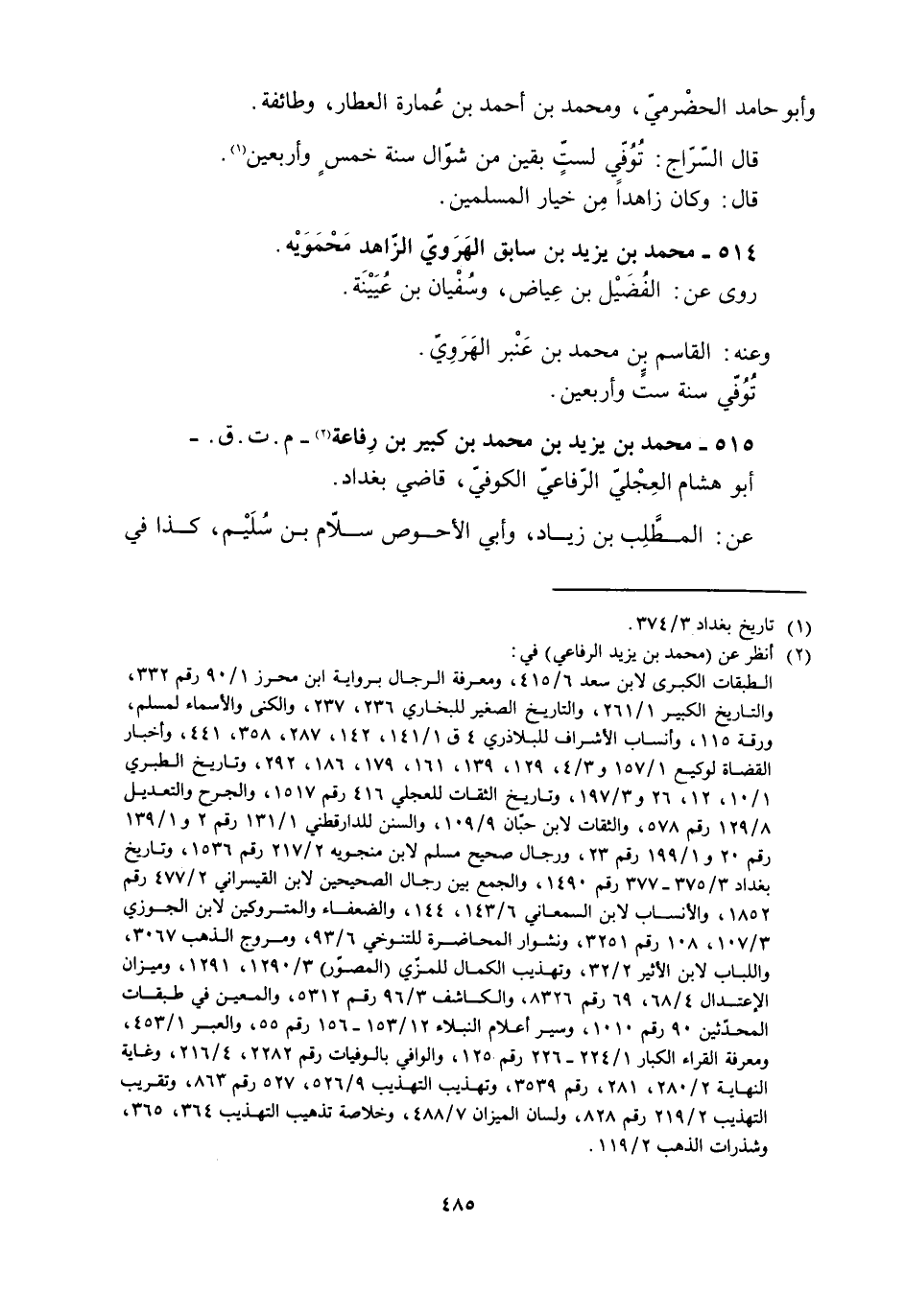 515- محمد بن يزيد بن محمد بن كبير بن رفاعة [2]- م. ت. ق. - أبو هشام العجليّ الرّفاعيّ الكوفيّ، قاضي بغداد.