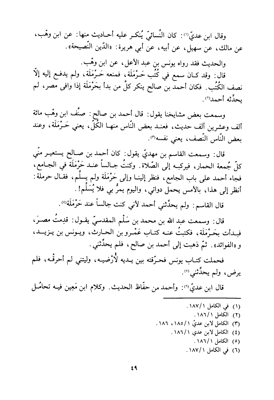 قال: وقد كان سمع في كُتُب حَرْمَلَة، فمنعه حَرْمَلَة، ولم يدفع إليه إلا نصف الكُتُب. فكان أحمد بن صالح ينكر كلَّ من بدأ بحَرْمَلَة إذا وافى مصر، لم يحدِّثه أحمد [2] .