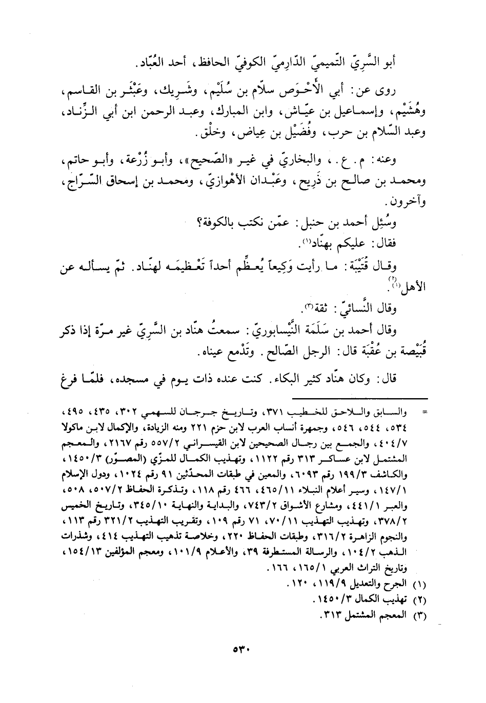 وقال قُتَيْبَةَ: ما رَأَيْت وَكِيعًا يُعظِّم أحدا تَعظيمه لهنّاد. ثمّ يسأله عن الأهل [1] [2] .