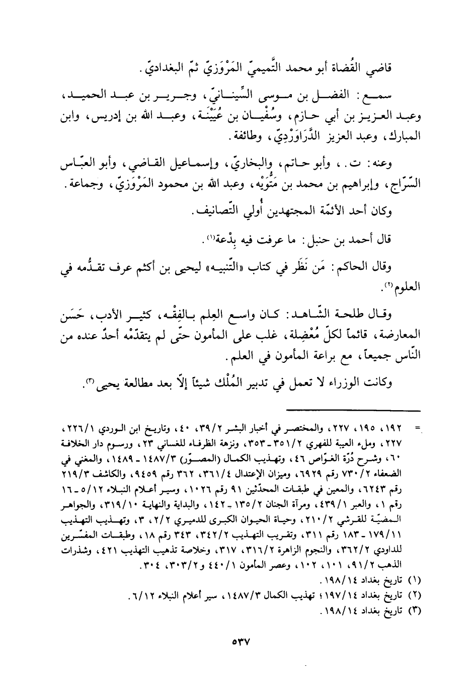 [2] تاريخ بغداد 14/ 197، تهذيب الكمال 3/ 1487، سير أعلام النبلاء 12/ 6.