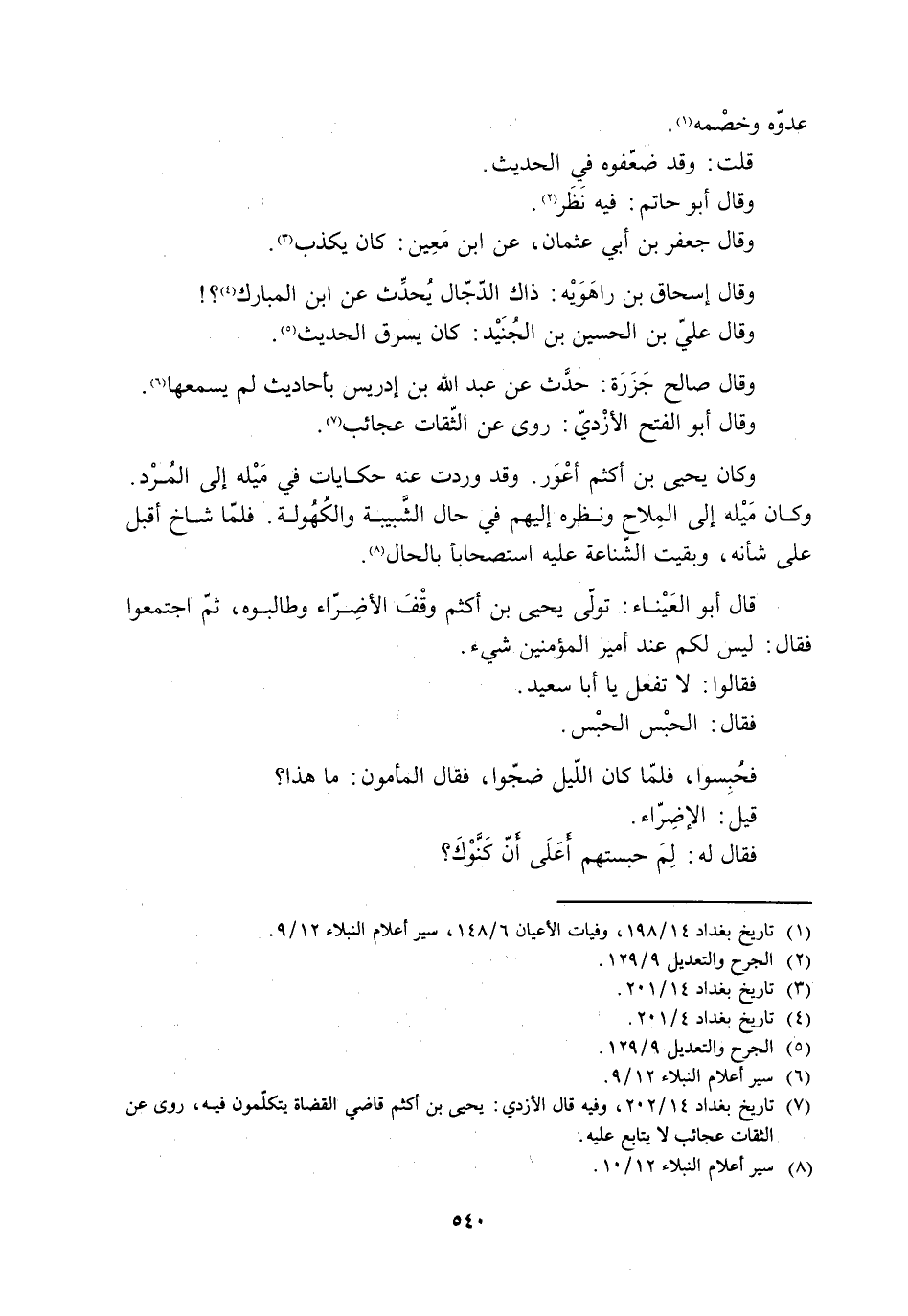 [7] تاريخ بغداد 14/ 202، وفيه قال الأزدي: يحيى بن أكثم قاضي القضاة يتكلّمون فيه، روى عن الثقات عجائب لا يتابع عليه.