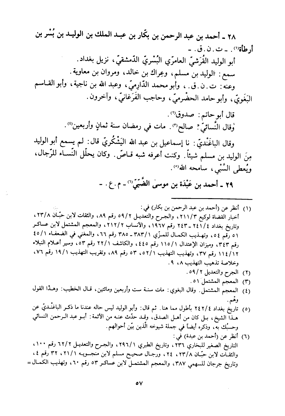28- أحمد بن عبد الرحمن بن بكّار بن عبد الملك بن الوليد بن بُسْر بن أرطاة [1] . - ت. ن. ق. - أبو الوليد القرشيّ العامري البسريّ الدّمشقيّ، نزيل بغداد.