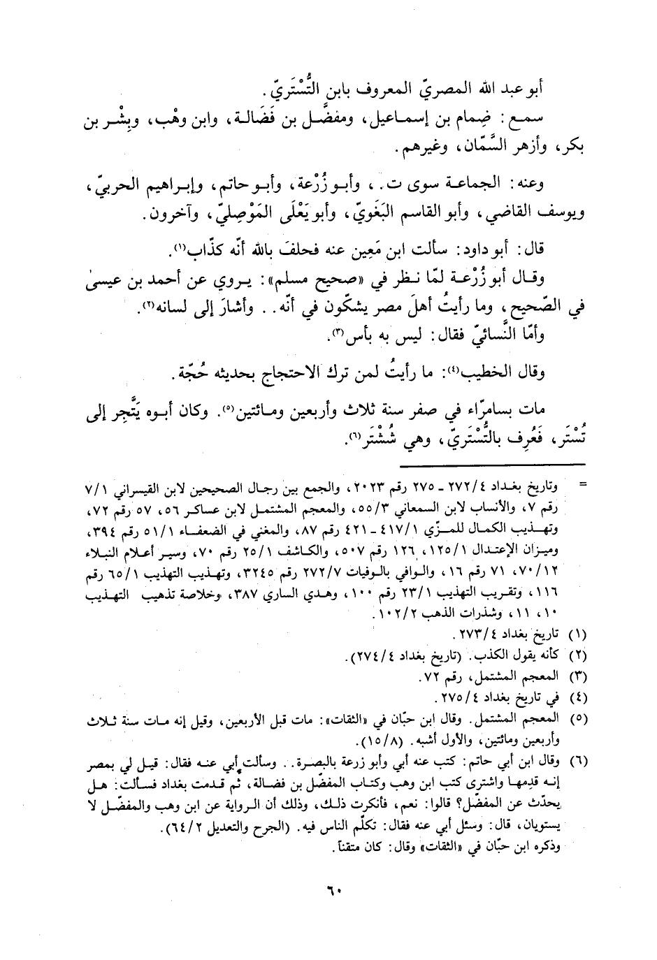 [6] وقال ابن أبي حاتم: كتب عنه أبي وأبو زرعة بالبصرة. وسألت أبي عنه فقال: قيل لي بمصر إنه قدمها واشترى كتب ابن وهب وكتاب المفضّل بن فضالة، ثم قدمت بغداد فسألت: هل يحدّث عن المفضّل؟ قالوا: نعم، فأنكرت ذلك، وذلك أن الرواية عن ابن وهب والمفضّل لا يستويان، قال: وسئل أبي عنه فقال: تكلّم الناس فيه. (الجرح والتعديل 2/ 64) .