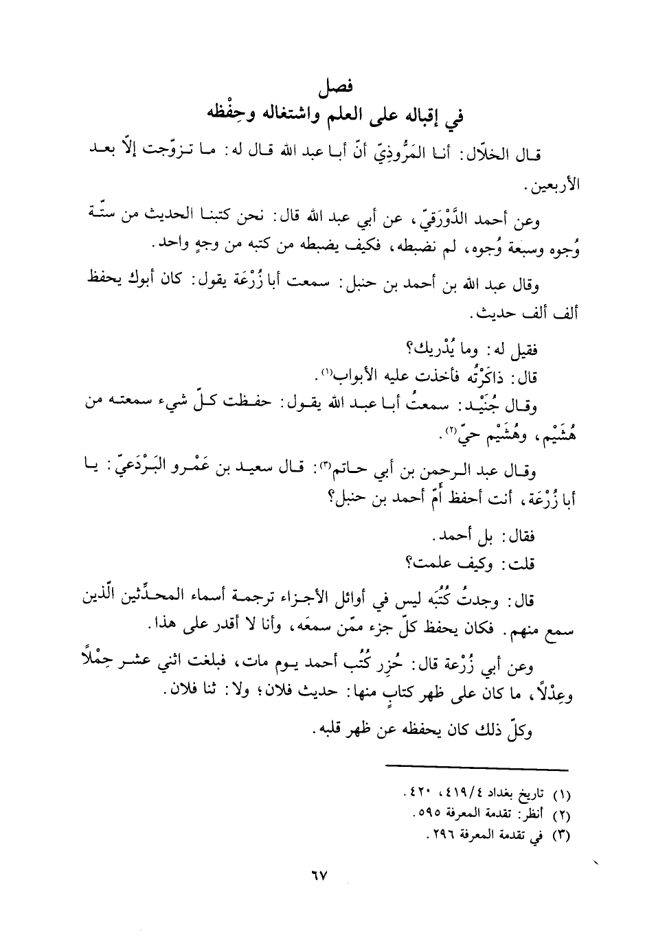 فصل في إقباله على العلم واشتغاله وحِفْظه قال الخلال: أنا المَرُّوذِيّ أنّ أبا عبد الله قال له: ما تزوّجت إلا بعد الأربعين.
