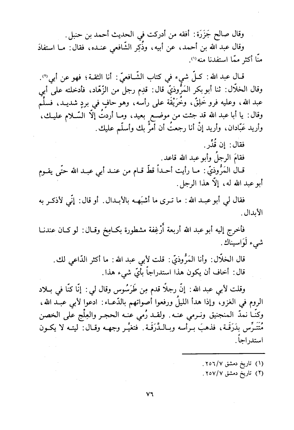وقال الخلال: ثنا أبو بكر المَرُّوذيّ قال: قدِم رجل من الزّهّاد، فأدخلته على أبي عبد الله، وعليه فرو خَلِقٌ، وخُرَيْقَة على رأسه، وهو حافٍ في بردٍ شديد، فسلَّم وقال: يا أبا عبد الله قد جئت من موضعٍ بعيد، وما أردتُ إلا السّلام عليك، وأريد عَبّادان، وأريد إنْ أنا رجعتُ أن أمرَّ بك وأسلّم عليك.