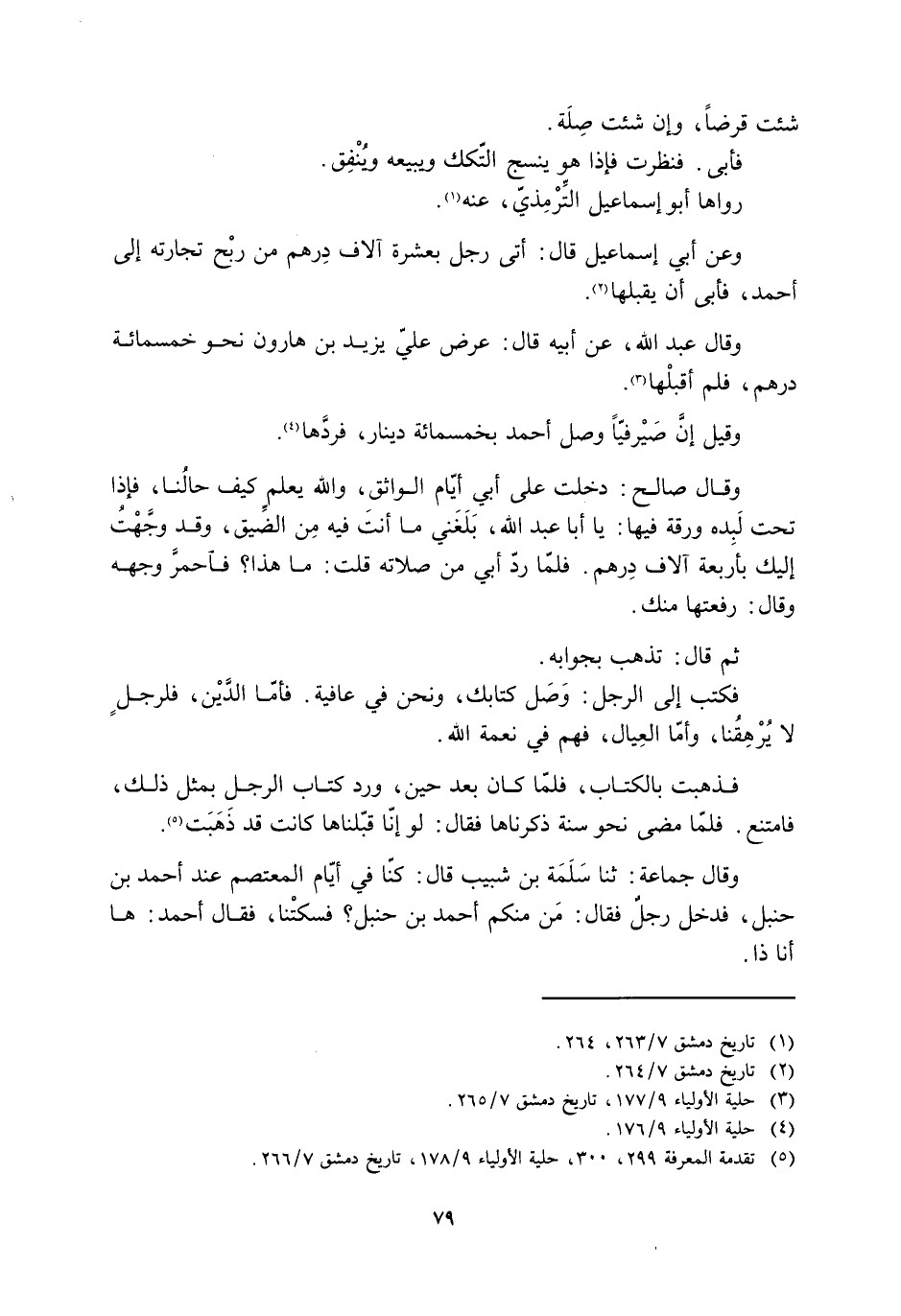 وقيل إنَّ صَيْرفيًا وصل أحمد بخمسمائة دينار، فردَّها [4] .