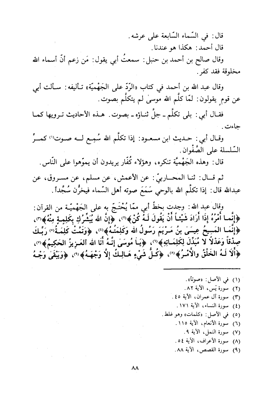 إِنَّما أَمْرُهُ إِذا أَرادَ شَيْئاً أَنْ يَقُولَ لَهُ كُنْ 36: 82 [2] ، إِنَّ الله يُبَشِّرُكِ بِكَلِمَةٍ مِنْهُ 3: 45 [3] ، إِنَّمَا الْمَسِيحُ عِيسَى ابْنُ مَرْيَمَ رَسُولُ اللَّهِ وَكَلِمَتُهُ 4: 171 [4] ، وَتَمَّتْ كَلِمَةُ [5] رَبِّكَ صِدْقاً وَعَدْلًا لا مُبَدِّلَ لِكَلِماتِهِ 6: 115 [6] ، يَا مُوسى إِنَّهُ أَنَا اللَّهُ الْعَزِيزُ الْحَكِيمُ 27: 9 [7] ، أَلا لَهُ الْخَلْقُ وَالْأَمْرُ 7: 54 [8] ، كُلُّ شَيْءٍ هالِكٌ إِلَّا وَجْهَهُ 28: 88 [9] ،