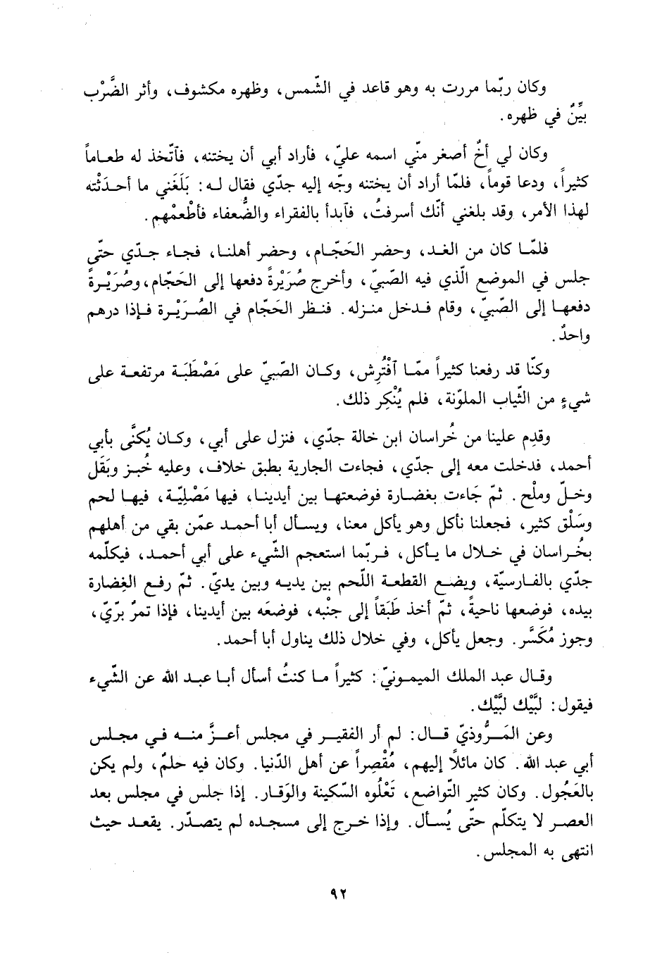 وقدِم علينا من خُراسان ابن خالة جدّي، فنزل على أبي، وكان يُكنَّى بأبي أحمد، فدخلت معه إلى جدّي، فجاءت الجارية بطبق خلاف، وعليه خبز وبَقْل وخلّ وملْح. ثم جَاءت بغضارة فوضعتها بين أيدينا، فيها مَصلية، فيها لحم وسَلْق كثير، فجعلنا نأكل وهو يأكل معنا، ويسأل أبا أحمد عمّن بقي من أهلهم بخُراسان في خلال ما يأكل، فربّما استعجم الشّيء على أبي أحمد، فيكلّمه جدّي بالفارسيّة، ويضع القطعة اللّحم بين يديه وبين يديّ. ثمّ رفع الغِضارة بيده، فوضعها ناحيةً، ثمّ أخذ طَبَقًا إلى جنْبه، فوضعَه بين أيدينا، فإذا تمرٌ برّيّ، وجوز مُكَسَّر. وجعل يأكل، وفي خلال ذلك يناول أبا أحمد.