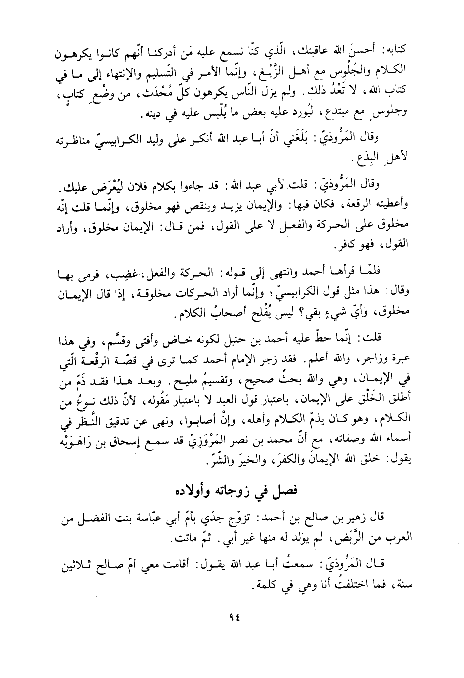 قلت: إنّما حطّ عليه أحمد بن حنبل لكونه خاض وأفتى وقسَّم، وفي هذا عبرة وزاجر، والله أعلم. فقد زجر الإمام أحمد كما ترى في قصّة الرقعة التي في الإيمان، وهي والله بحثٌ صحيح، وتقسيمٌ مليح. وبعد هذا فقد ذَمّ من أطلق الخَلْق على الإيمان، باعتبار قول العبد لا باعتبار مَقُوله، لأنّ ذلك نوعٌ من الكلام، وهو كان يذمّ الكلام وأهله، وإنْ أصابوا، ونهى عن تدقيق النَّظر في أسماء الله وصفاته، مع أنّ محمد بن نصر المروزيّ قد سمع إسحاق بن رَاهوَيْه يقول: خلق الله الإيمان والكفر، والخيرَ والشّرّ.