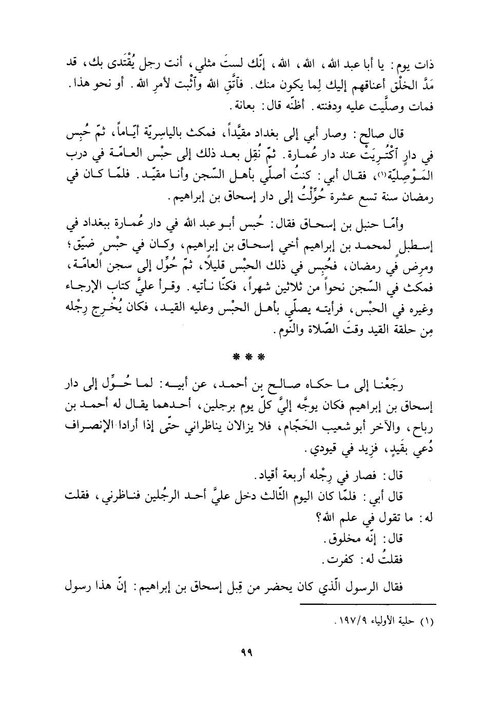 قال صالح: وصار أبي إلى بغداد مقيَّدًا، فمكث بالياسريّة أيّامًا، ثمّ حُبِس في دارٍ اكْتُرِيَتْ عند دار عُمارة. ثمّ نُقِل بعد ذلك إلى حبْس العامّة في درب المَوْصِليّة [1] ، فقال أبي: كنتُ أصلّي بأهل السّجن وأنا مقيّد. فلمّا كان في رمضان سنة تسع عشرة حُوِّلْتُ إلى دار إسحاق بن إبراهيم.