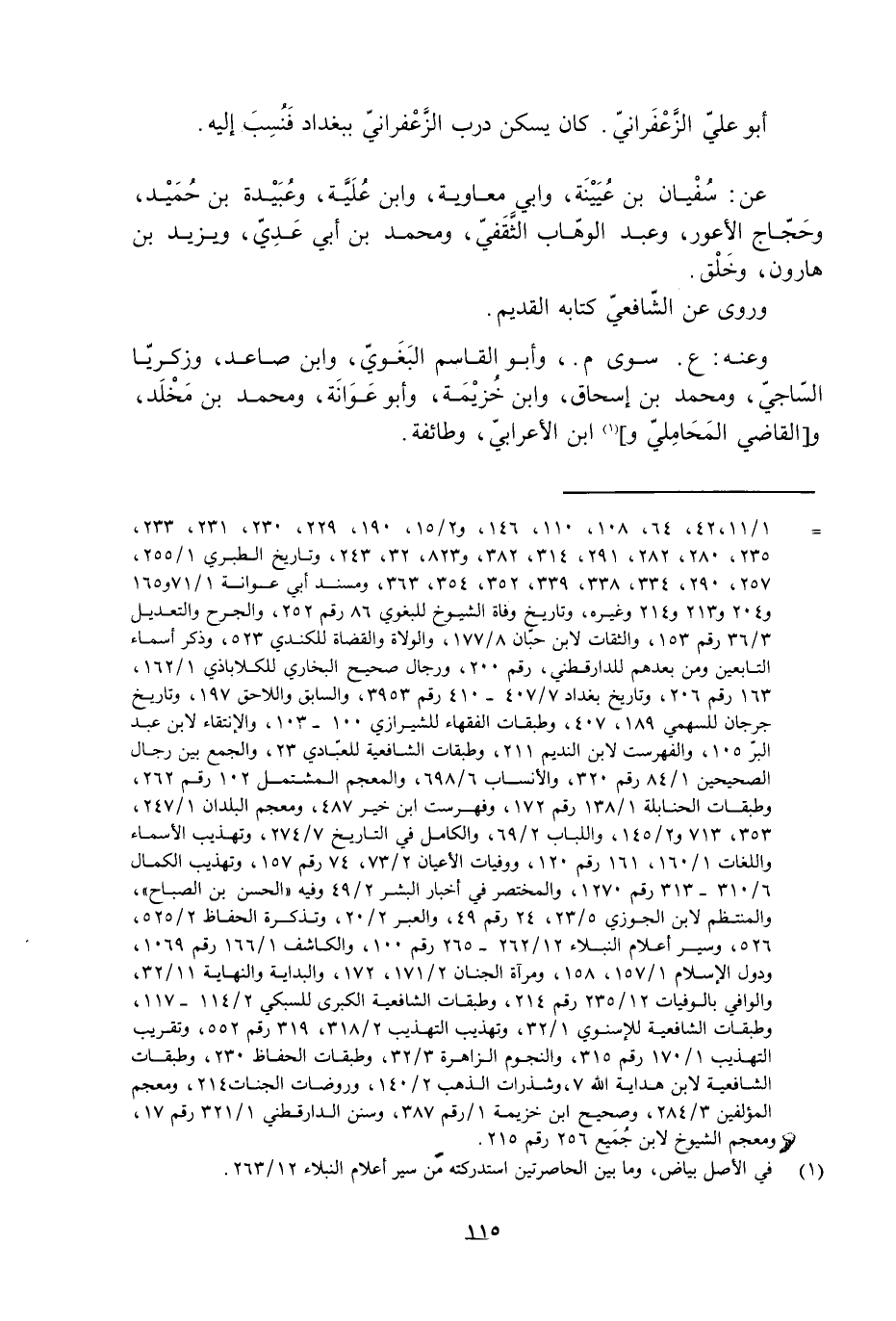 [1] / 11، 42، 64، 108، 110، 146، و 2/ 15، 190، 229، 230، 231، 233، 235، 280، 282، 291، 314، 382، و 823، 32، 243، وتاريخ الطبري 1/ 255، 257، 290، 334، 338، 339، 352، 354، 363، ومسند أبي عوانة 1/ 71 و 165 و 204 و 213 و 214 وغيره، وتاريخ وفاة الشيوخ للبغوي 86 رقم 252، والجرح والتعديل 3/ 36 رقم 153، والثقات لابن حبّان 8/ 177، والولاة والقضاة للكندي 523، وذكر أسماء التابعين ومن بعدهم للدار للدّارقطنيّ، رقم 200، ورجال صحيح البخاري للكلاباذي 1/ 162، 163 رقم 206، وتاريخ بغداد 7/ 407- 410 رقم 3953، والسابق واللاحق 197، وتاريخ جرجان للسهمي 189، 407، وطبقات الفقهاء للشيرازي 100- 103، والإنتقاء لابن عبد البرّ 105، والفهرست لابن النديم 211، وطبقات الشافعية للعبّادي 23، والجمع بين رجال الصحيحين 1/ 84 رقم 320، والأنساب 6/ 698، والمعجم المشتمل 102 رقم 262، وطبقات الحنابلة 1/ 138 رقم 172، وفهرست ابن خير 487، ومعجم البلدان 1/ 247، 353، 713 و 2/ 145، واللباب 2/ 69، والكامل في التاريخ 7/ 274، وتهذيب الأسماء واللغات 1/ 160، 161 رقم 120، ووفيات الأعيان 2/ 73، 74 رقم 157، وتهذيب الكمال 6/ 310- 313 رقم 1270، والمختصر في أخبار البشر 2/ 49 وفيه «الحسن بن الصباح» ، والمنتظم لابن الجوزي 5/ 23، 24 رقم 49، والعبر 2/ 20، وتذكرة الحفاظ 2/ 525، 526، وسير أعلام النبلاء 12/ 262- 265 رقم 100، والكاشف 1/ 166 رقم 1069، ودول الإسلام 1/ 157، 158، ومرآة الجنان 2/ 171، 172، والبداية والنهاية 11/ 32، والوافي بالوفيات 12/ 235 رقم 214، وطبقات الشافعية الكبرى للسبكي 2/ 114- 117، وطبقات الشافعية للإسنويّ 1/ 32، وتهذيب التهذيب 2/ 318، 319 رقم 552، وتقريب التهذيب 1/ 170 رقم 315، والنجوم الزاهرة 3/ 32، وطبقات الحفاظ 230، وطبقات الشافعية لابن هداية الله 7، وشذرات الذهب 2/ 140، وروضات الجنات 214، ومعجم المؤلفين 3/ 284، وصحيح ابن خزيمة 1/ رقم 387، وسنن الدار الدّارقطنيّ 1/ 321 رقم 17، ومعجم الشيوخ لابن جميع 256 رقم 215.