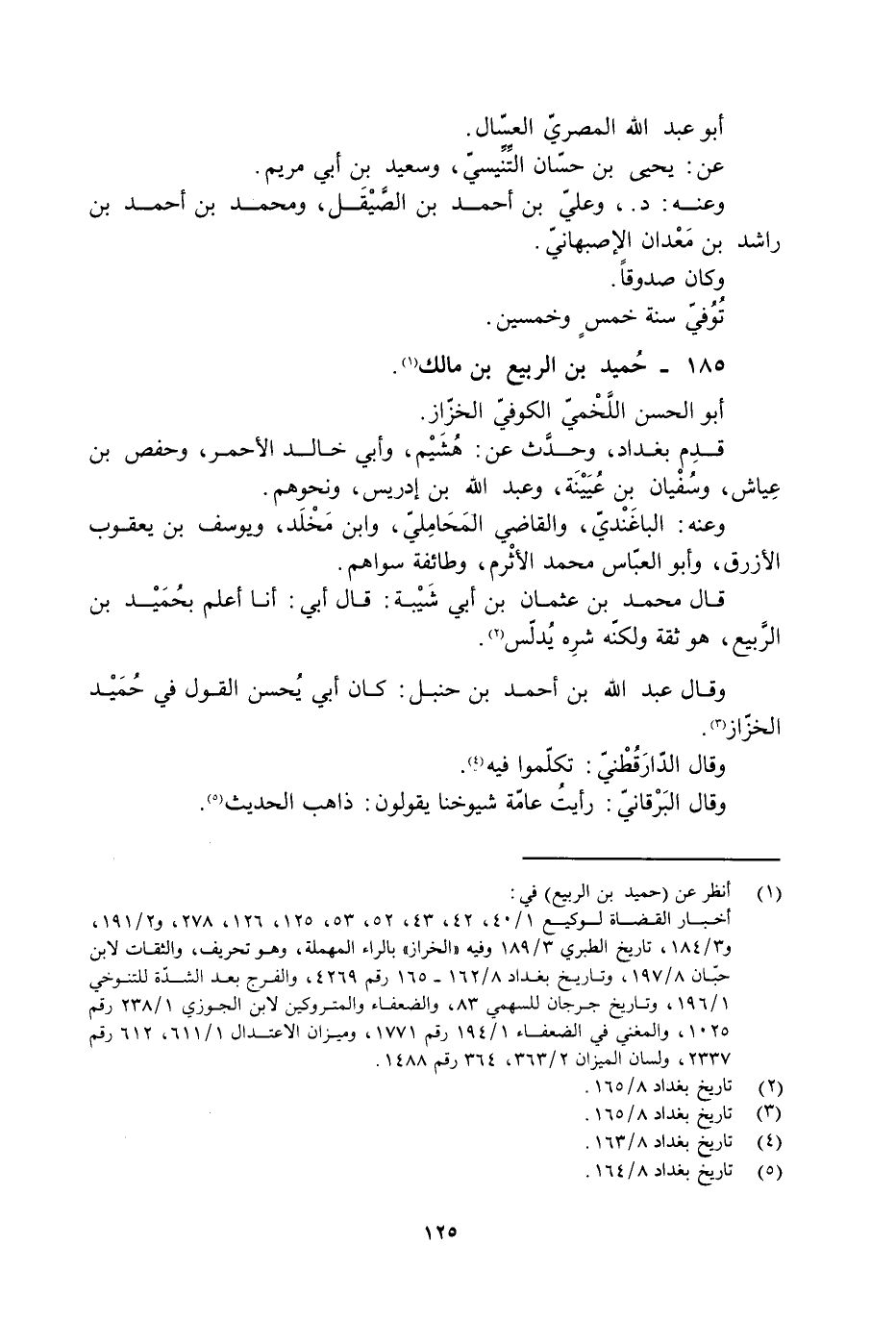 وَقَالَ عَبْدُ اللَّهِ بْنُ أَحْمَدَ بْنِ حَنْبَلٍ: كَانَ أَبِي يُحسن القول في حميد الخزّاز [3] .