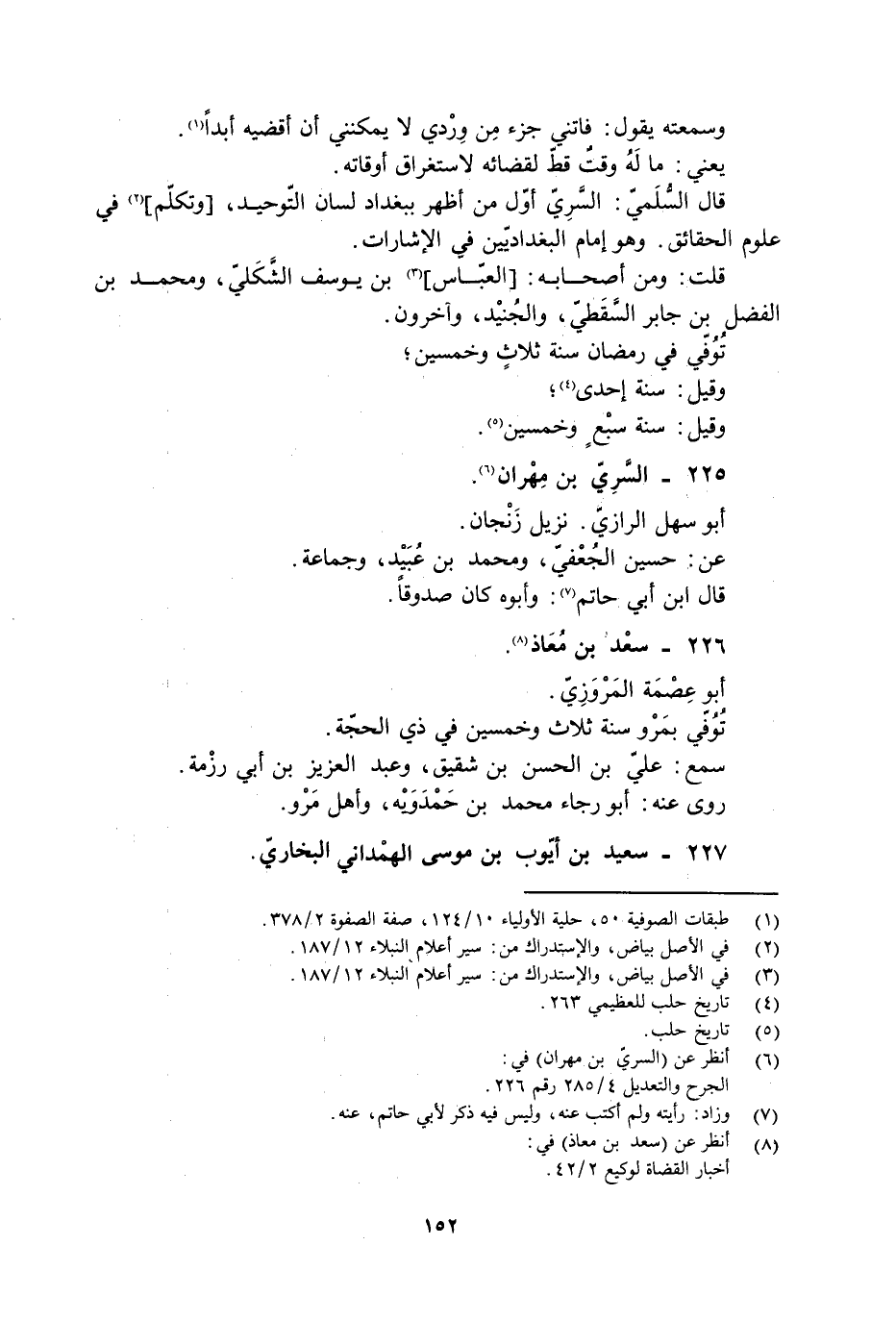 قَالَ السُّلَميّ: السّرِيّ أوّل من أظهر ببغداد لسان التّوحيد، [وتكلّم] [2] فِي علوم الحقائق. وهو إمام البغدادّيين فِي الإشارات.
