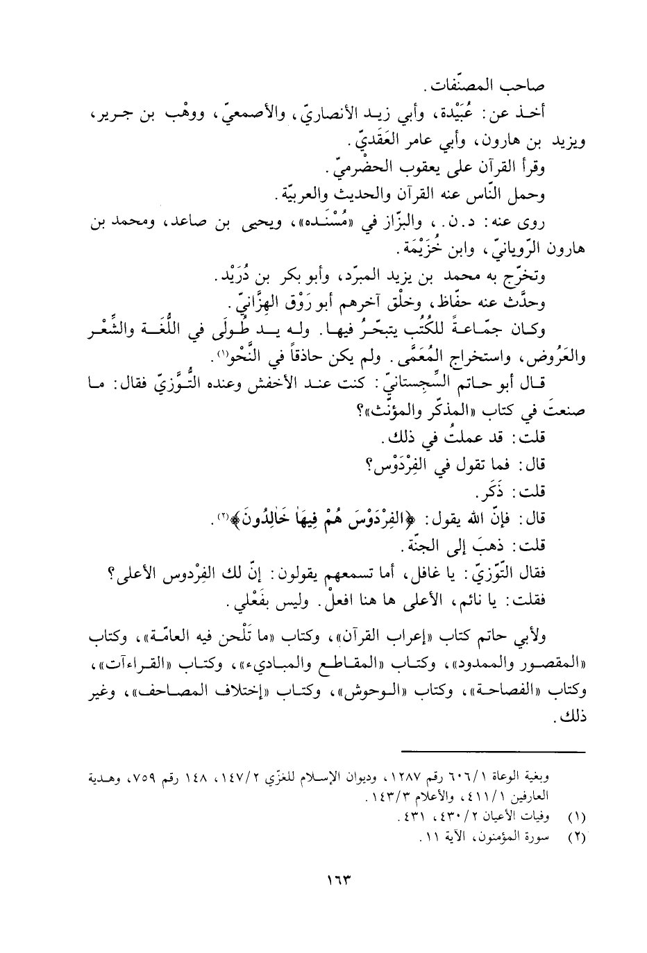 قَالَ أَبُو حاتم السِّجِسْتانيّ: كنت عند الأخفش وعنده التُّوَّزيّ فقال: ما صنعت فِي كتاب «المذكّر والمؤنثّ» ؟