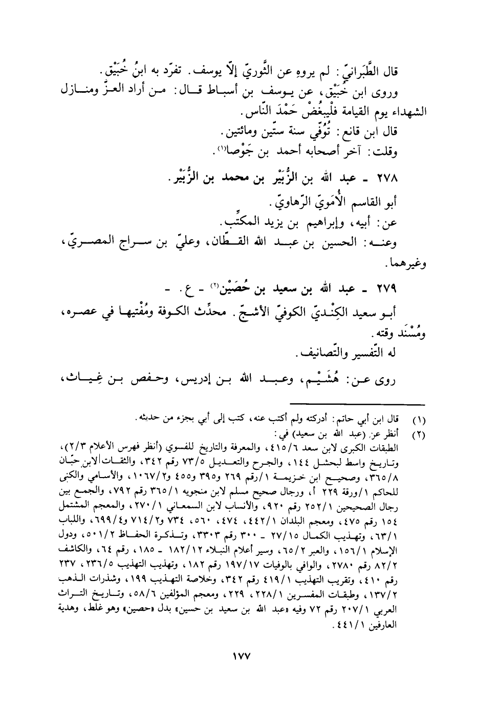 279- عَبْد اللَّه بْن سعَيِد بْن حصين [2]- ع. - أبو سعيد الكنديّ الكوفيّ الأشجّ. مُحَدَّث الكوفة ومُفتيها فِي عصره، ومُسْنَد وقته.