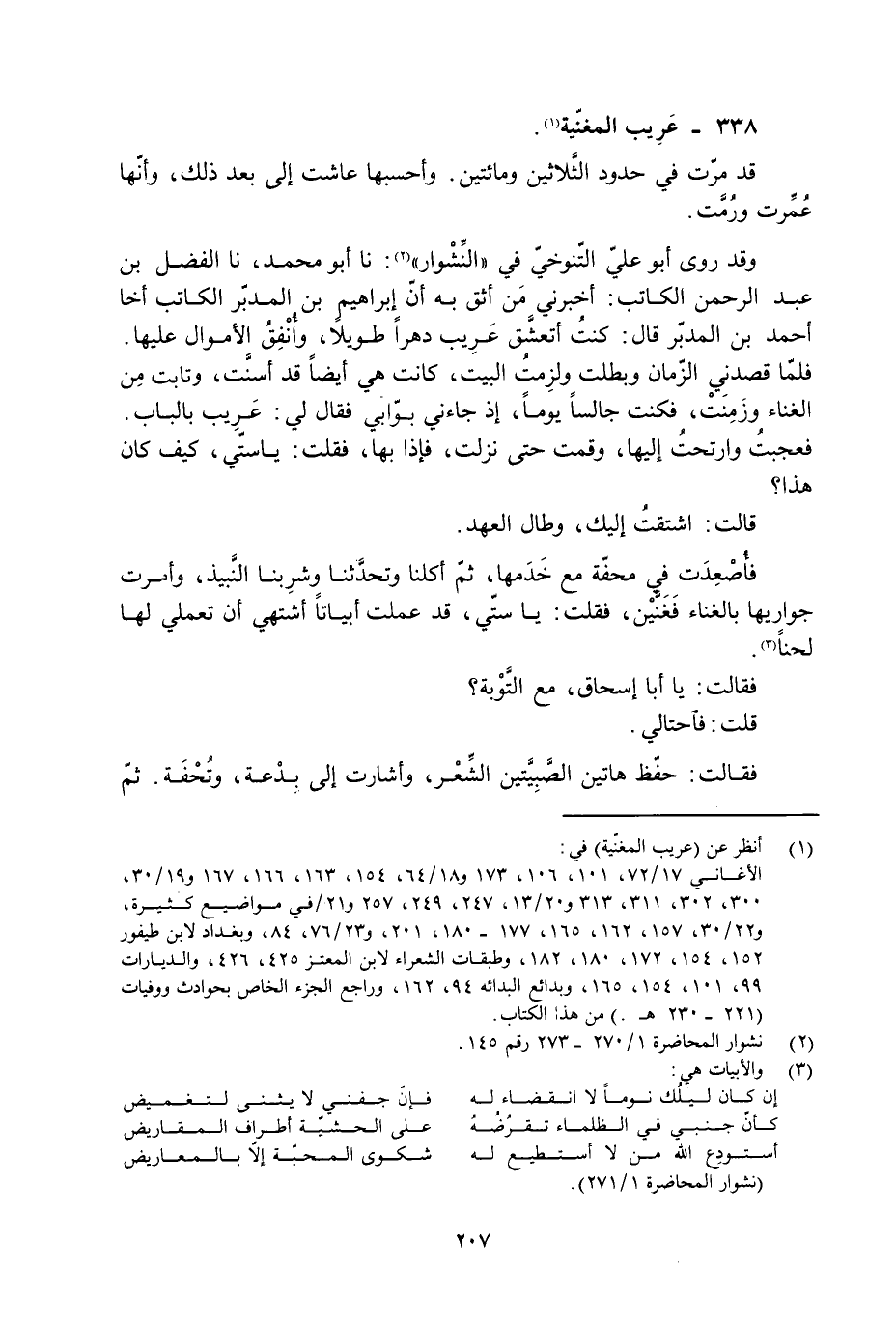 وقد روى أبو علي التنوخي في «النشوار» [2] : نا أَبُو محمد، نا الفضل بْن عَبْد الرَّحْمَن الكاتب: أخبرني مَن أثق بِهِ أنّ إِبْرَاهِيم بْن المدبرّ الكاتب أخا أَحْمَد بْن المدبّر قَالَ: كنتُ أتعشَّق عَرِيب دهرًا طويلَا، وأُنْفِقُ الأموال عليها.