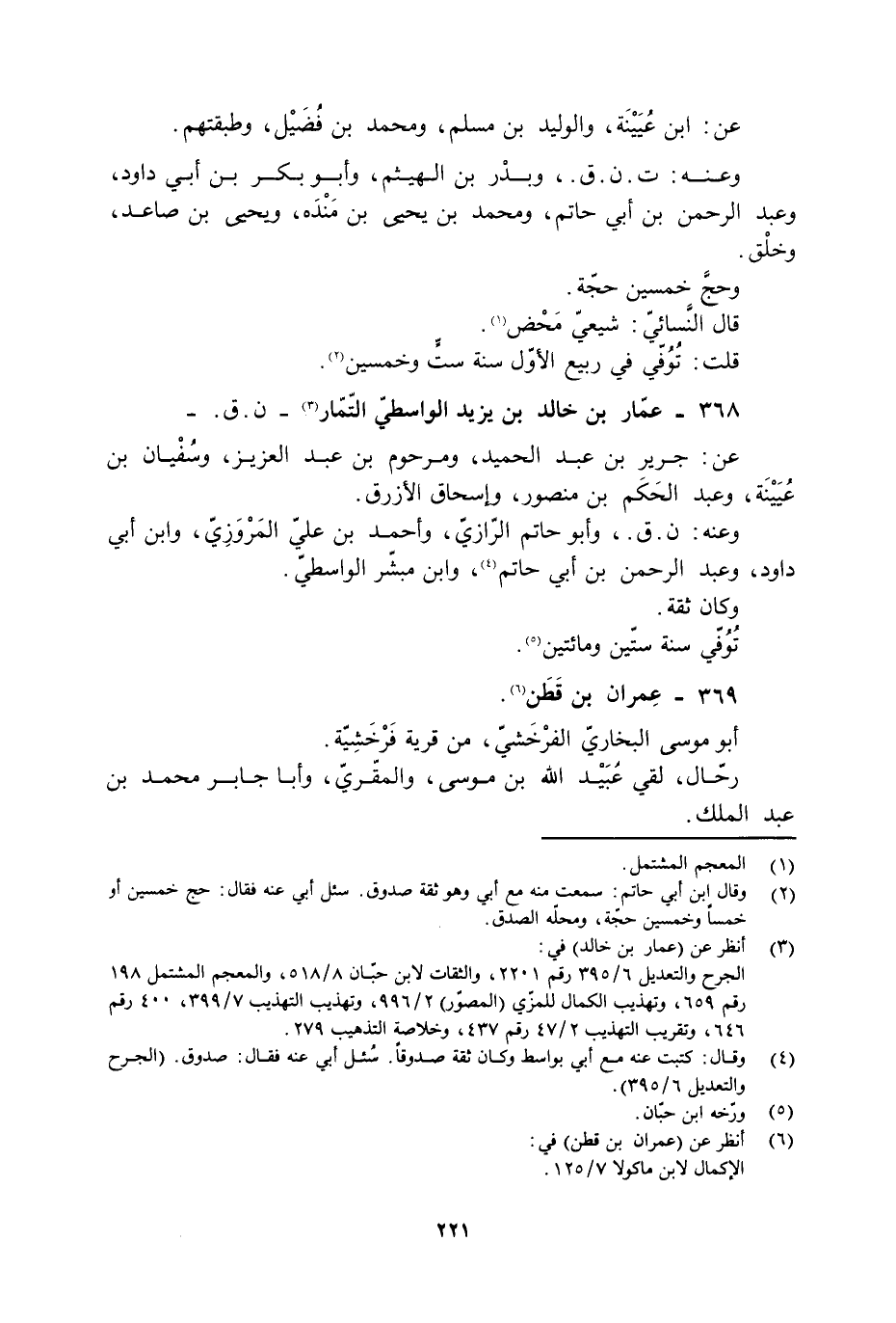 368- عمّار بْن خَالِد بْن يزيد الواسطيّ التمار [3]- ن. ق. - عَنْ: جرير بْن عَبْد الحميد، ومرحوم بْن عَبْد العزيز، وسُفْيَان بْن عُيَيْنَة، وعَبْد الحَكَم بْن منصور، وإِسْحَاق الأزرق.