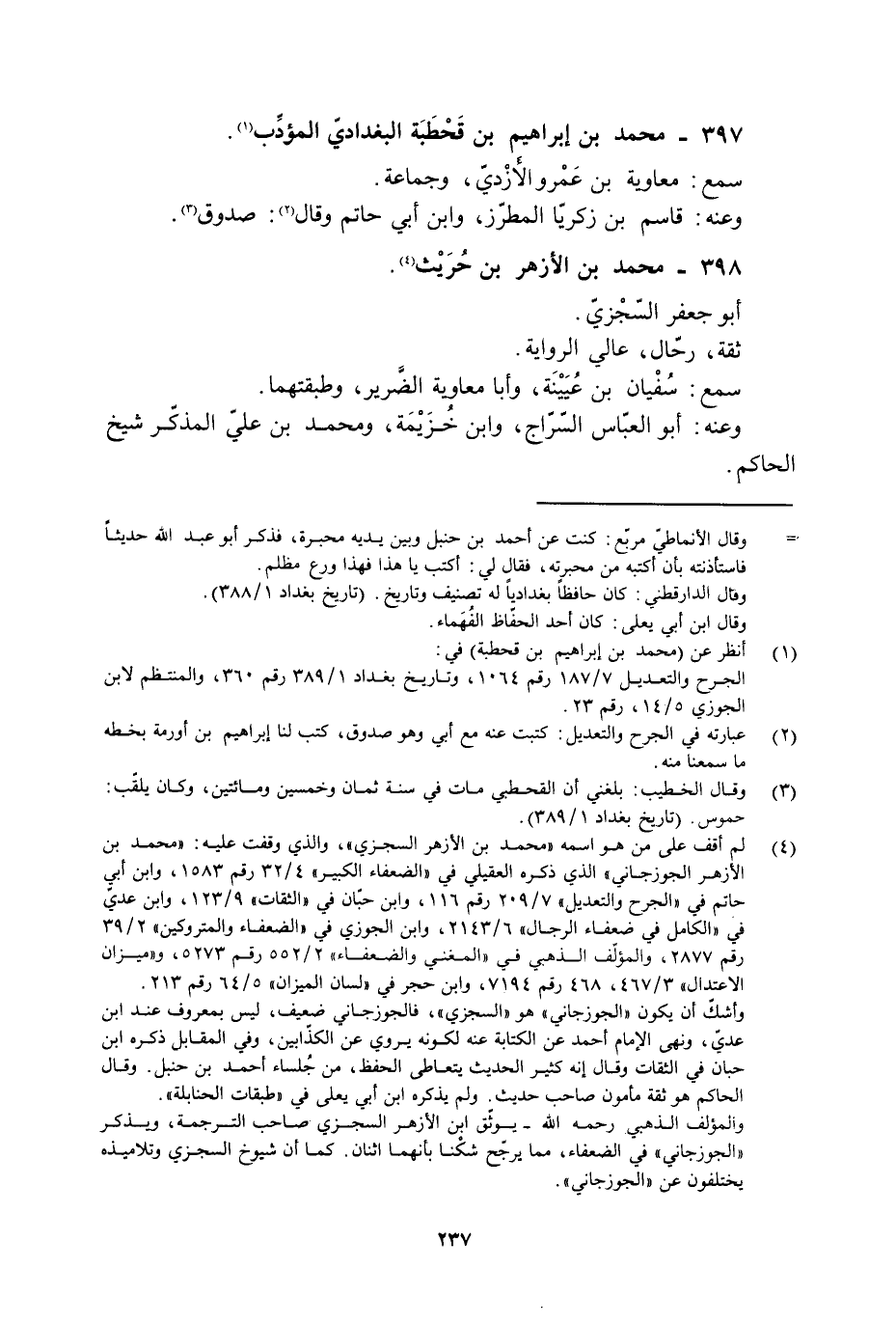 وأشكّ أن يكون «الجوزجاني» هو «السجزيّ» ، فالجوزجاني ضعيف، ليس بمعروف عند ابن عديّ، ونهى الإمام أحمد عن الكتابة عنه لكونه يروي عن الكذّابين، وفي المقابل ذكره ابن حبان في الثقات وقال إنه كثير الحديث يتعاطى الحفظ، من جلساء أحمد بن حنبل. وقال الحاكم هو ثقة مأمون صاحب حديث. ولم يذكره ابن أبي يعلى في «طبقات الحنابلة» .
