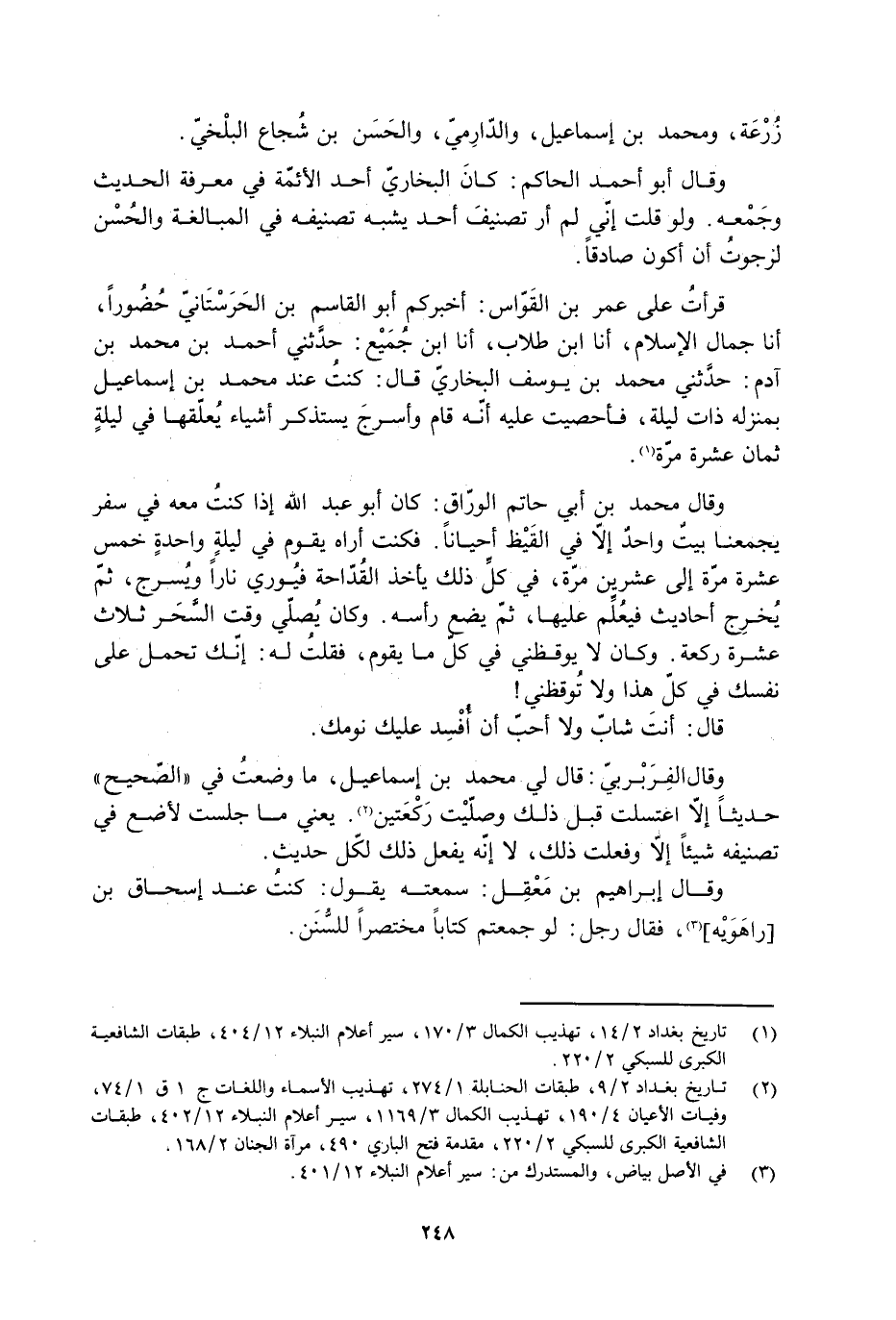 قرأتُ عَلَى عُمَر بْن القَوّاس: أخبركم أَبُو القاسم بْن الحّرَسْتانيّ حُضُورًا، أَنَا جَمَالُ الْإِسلَام، أَنَا ابن طلَاب، أَنَا ابن جُمَيْع: حدثني أَحْمَد بْن محمد بْن آدم: حدثني محمد بْن يوسف الْبُخَارِيّ قَالَ: كنتُ عند محمد بْن إِسْمَاعِيل بمنزله ذات ليلة، فأحصيت عَلَيْهِ أنّه قام وأسرجَ يستذكر أشياء يُعلّقها فِي لَيْلَةٍ ثمان عشرة مرّة [1] .