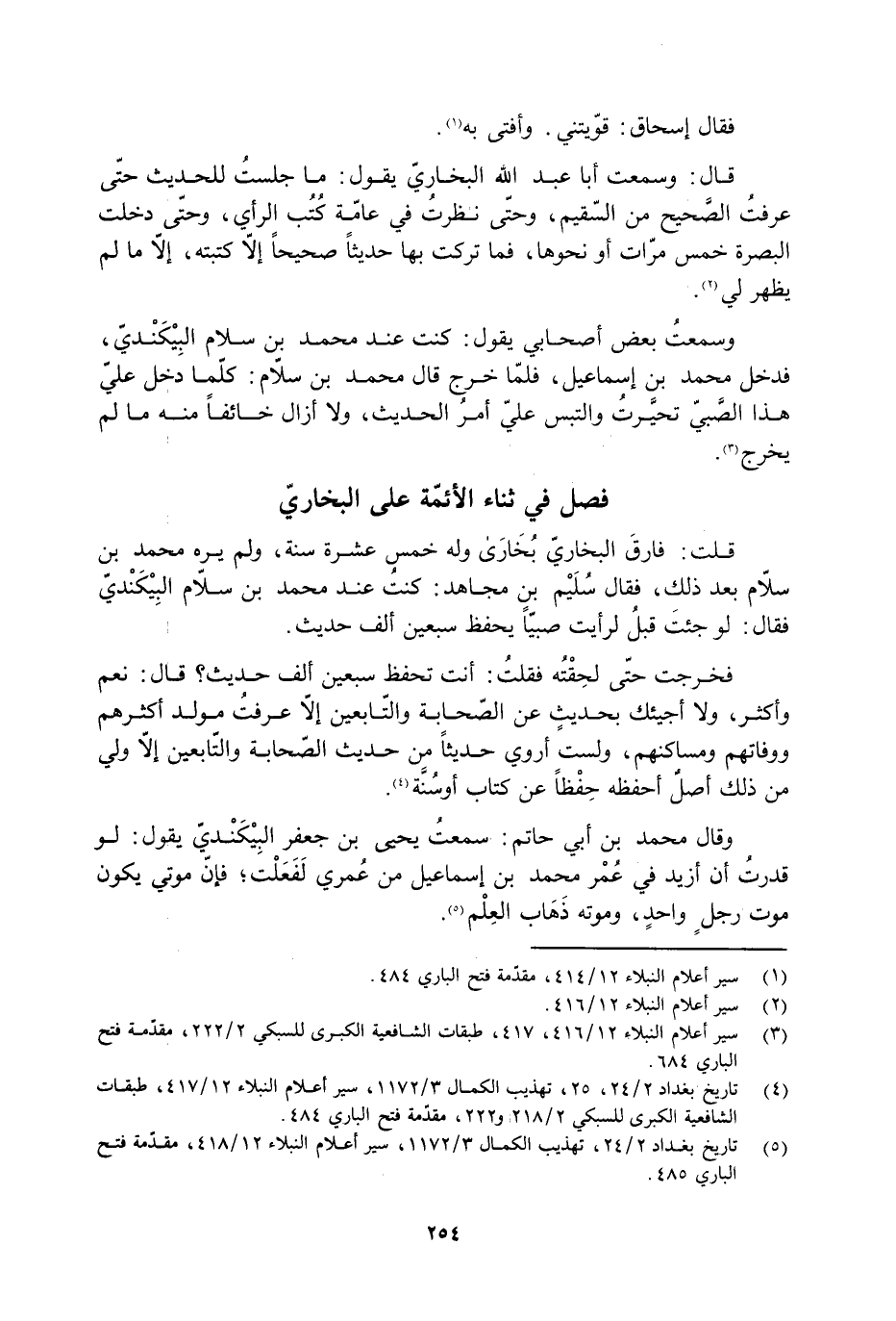 فصل فِي ثناء الأئمّة عَلى الْبُخَارِيّ قلت: فارقّ الْبُخَارِيّ بخاري وله خمس عشرة سنة، ولم يره محمد بْن سلَام بعد ذَلِكَ، فقال سُلَيْم بْن مجاهد: كنتُ عند محمد بْن سلَام البِيكَنْديّ فقال: لو جئت قبلُ لرأيت صبيًّا يحفظ سبعين ألف حديث.