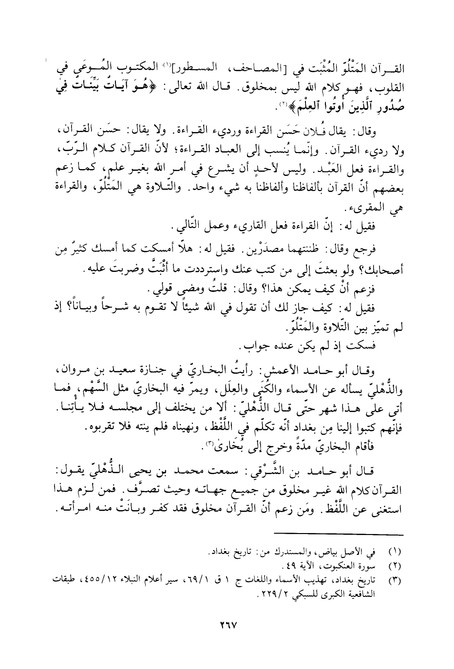 القرآن المَتْلُوّ المُثْبَت فِي [المصاحف، المسطور] [1] المكتوب المُوعَى فِي القلوب، فهو كلَام اللَّه لَيْسَ بمخلوق. قَالَ اللَّه تعالي: هُوَ آياتٌ بَيِّناتٌ في صُدُورِ الَّذِينَ أُوتُوا الْعِلْمَ 29: 49 [2] .