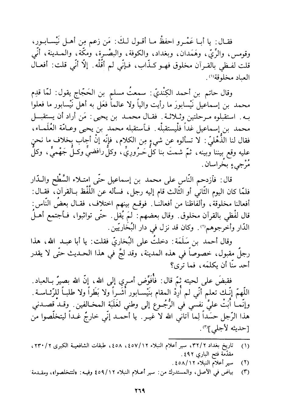 [1] تاريخ بغداد 2/ 32، سير أعلام النبلاء 12/ 457، 458، طبقات الشافعية الكبرى 2/ 230، مقدّمة فتح الباري 492.