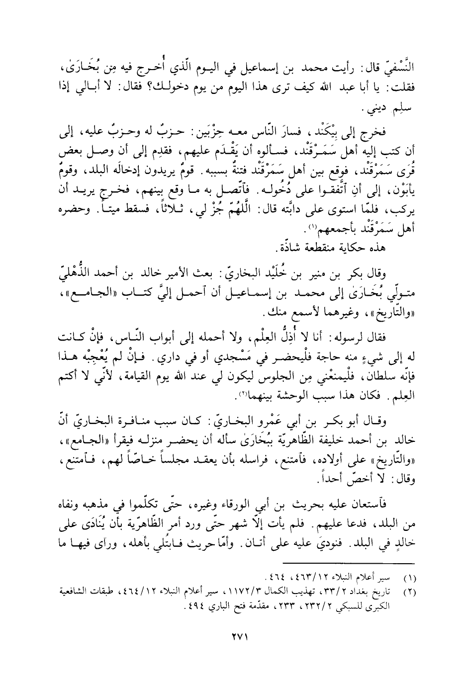 النَّسَفيّ قَالَ: رَأَيْت محمد بْن إِسْمَاعِيل فِي اليوم الَّذِي أُخرج فِيهِ مِن بُخَارى، فقلت: يا أَبَا عَبْد اللَّه كيف ترى هذا اليوم من يوم دخولك؟ فقال: لَا أبالي إذا سلم ديني.