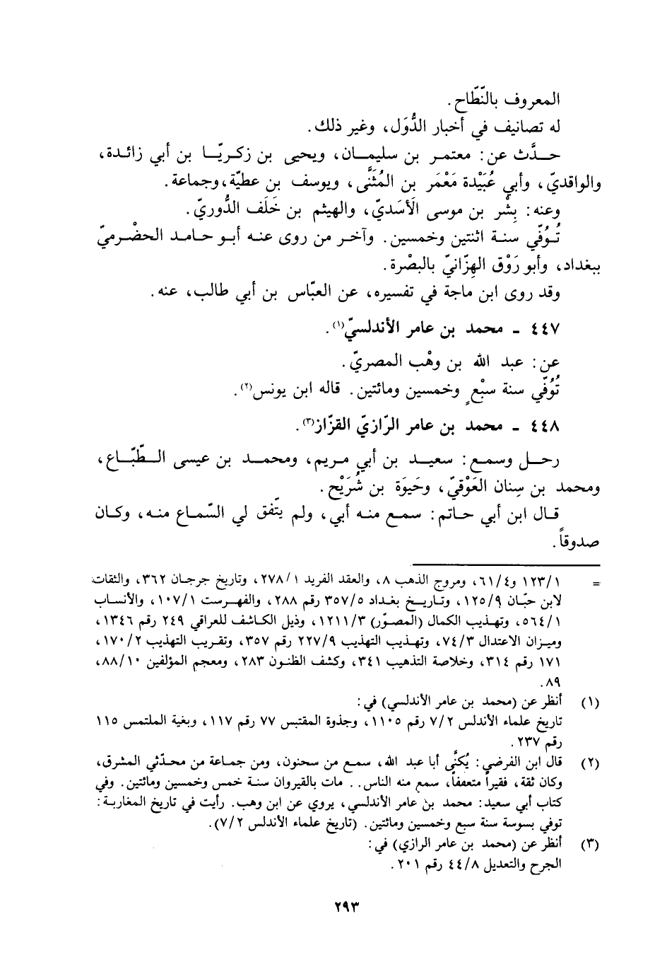[2] قال ابن الفرضيّ: يكنّى أبا عبد الله، سمع من سحنون، ومن جماعة من محدّثي المشرق، وكان ثقة، فقيرا متعففا، سمع منه الناس.. مات بالقيروان سنة خمس وخمسين ومائتين. وفي كتاب أبي سعيد: محمد بن عامر الأندلسي، يروي عن ابن وهب. رأيت في تاريخ المغاربة: