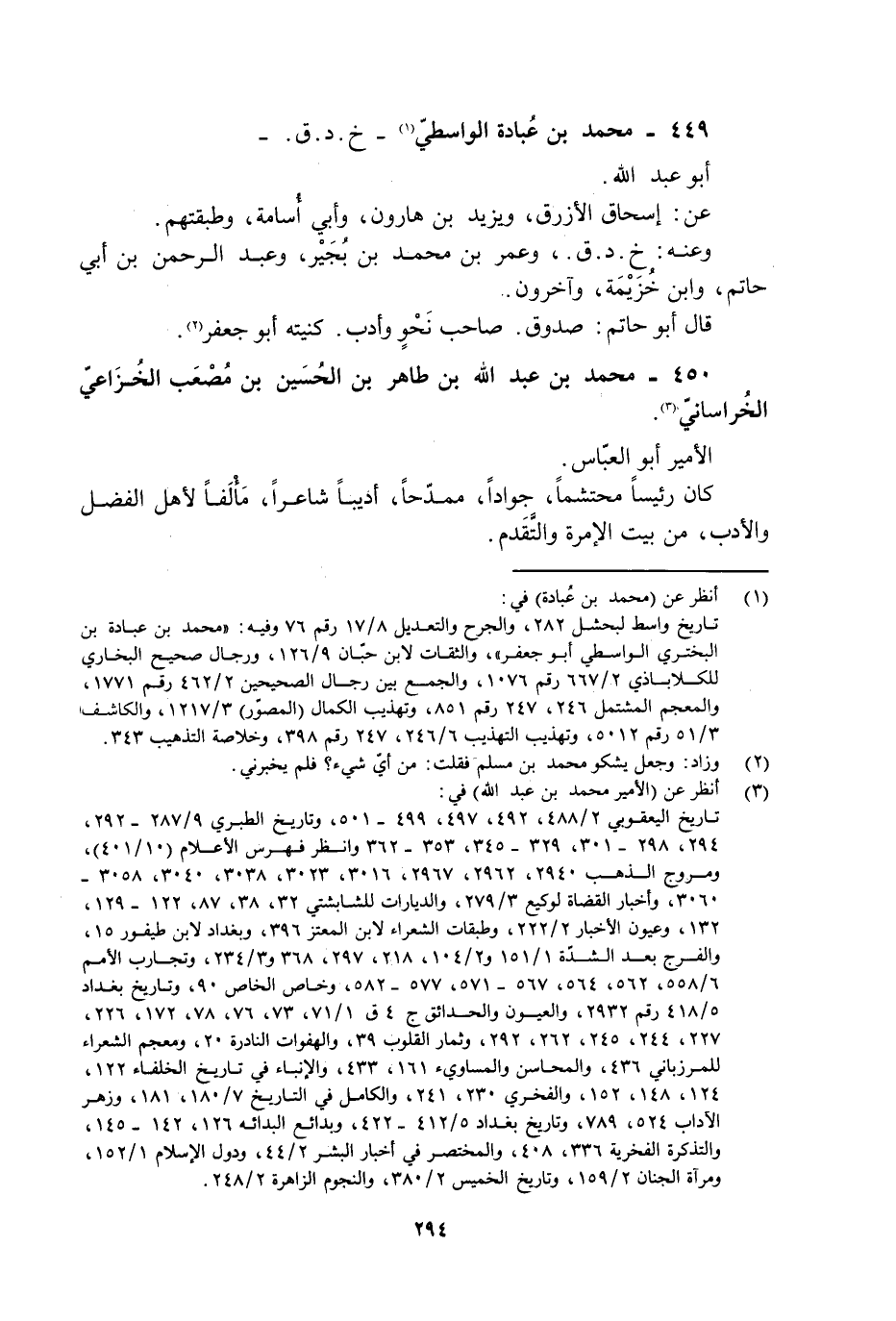 450- محمد بْن عَبْد اللَّه بْن طاهر بْن الْحُسَيْن بْن مُصْعَب الخُزاعيّ الخُرَاسانيّ [3] .