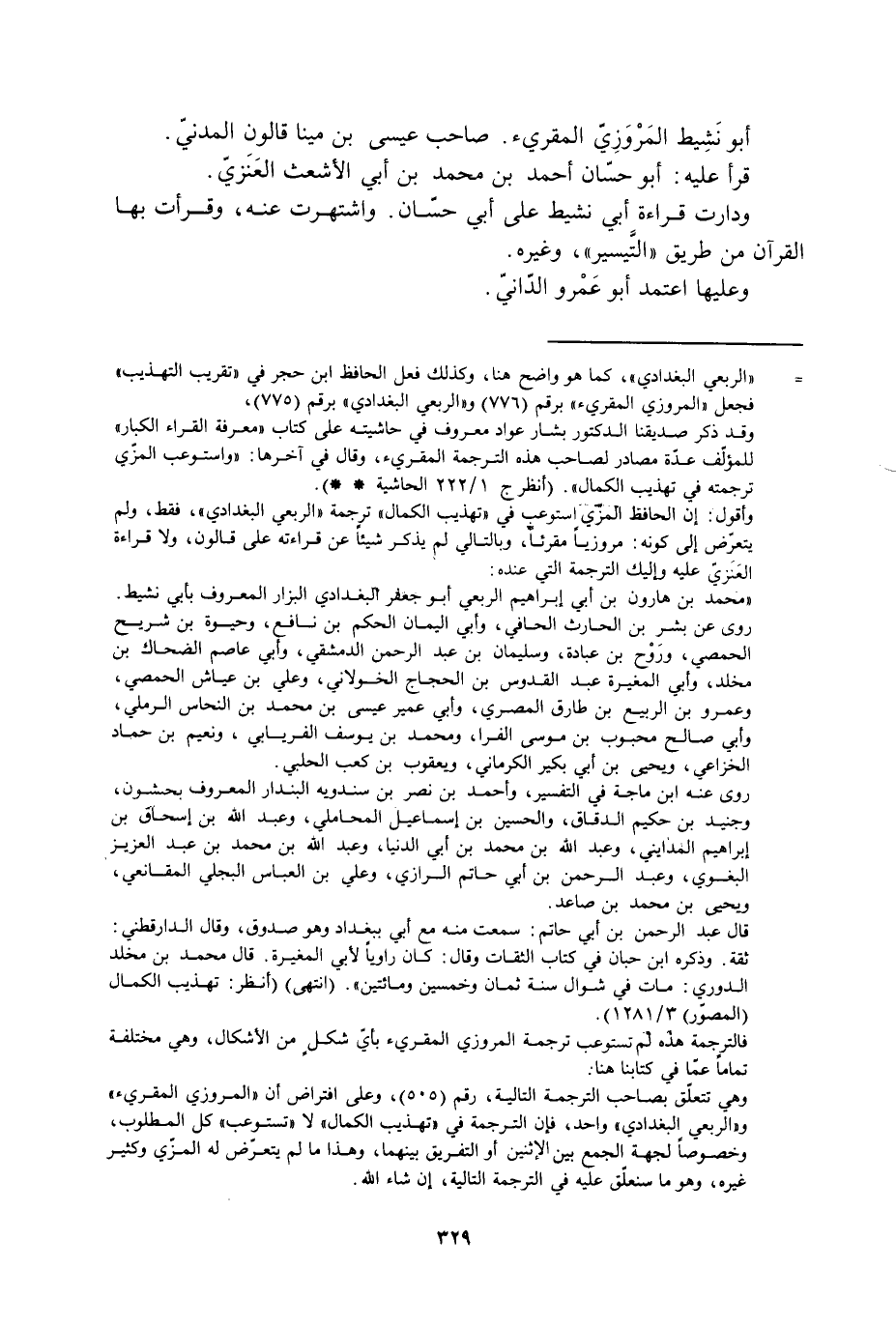 [ () ] «الربعي البغدادي» ، كما هو واضح هنا، وكذلك فعل الحافظ ابن حجر في «تقريب التهذيب» فجعل «المروزي المقرئ» برقم (776) و «الربعي البغدادي» برقم (775) ، وقد ذكر صديقنا الدكتور بشار عواد معروف في حاشيته على كتاب «معرفة القراء الكبار» للمؤلّف عدّة مصادر لصاحب هذه الترجمة المقرئ، وقال في آخرها: «واستوعب المزّي ترجمته في تهذيب الكمال» . (انظر ج 1/ 222 الحاشية) .