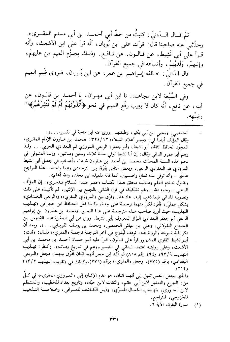 ثمّ قَالَ الدّانيّ: كتبتُ من خطّ أَبِي أَحْمَد بْن أَبِي مُسلْمِ المقرئ.