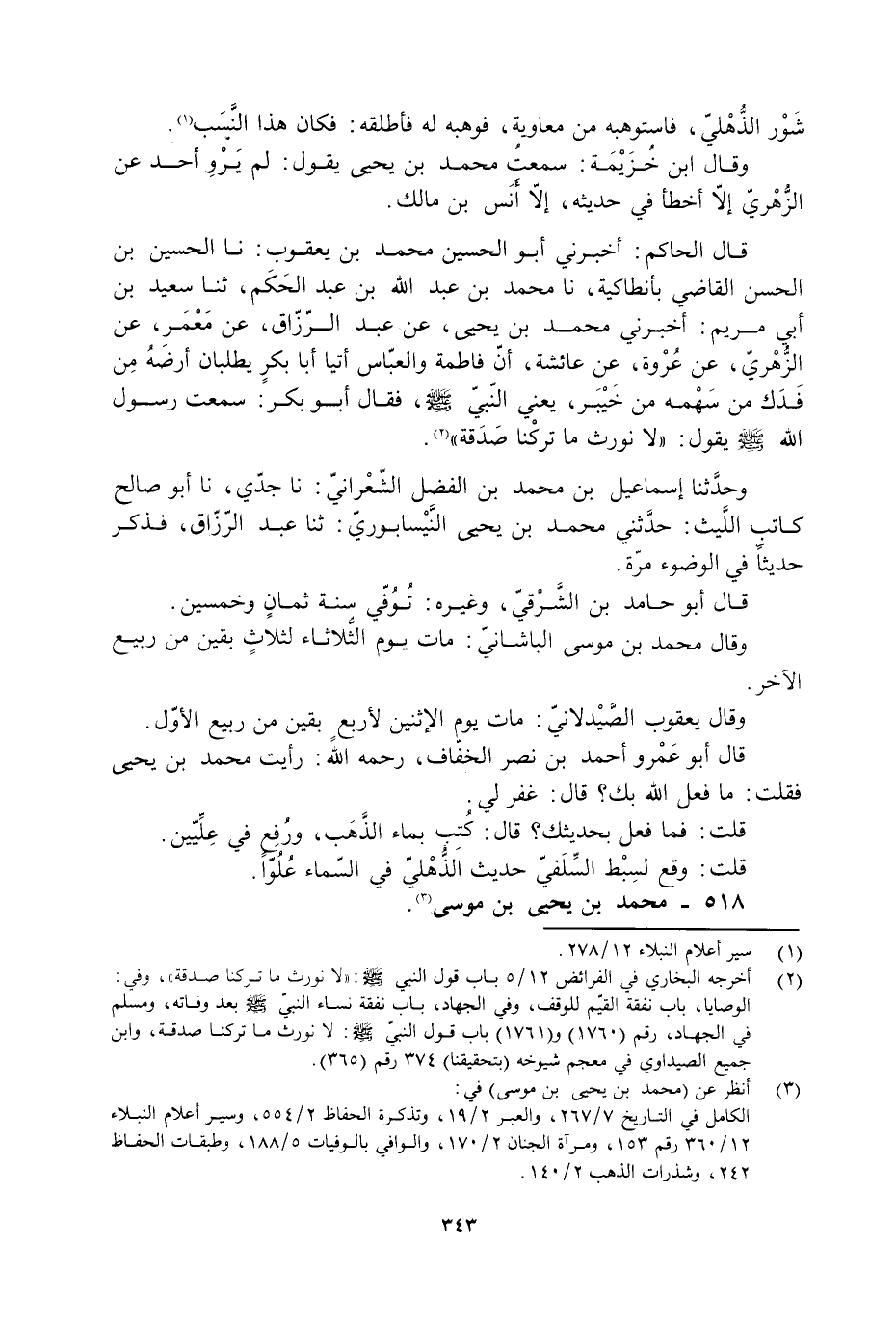 قَالَ الْحَاكِمُ: أَخْبَرَنِي أَبُو الْحُسَيْنِ محمد بْنُ يَعْقُوبَ: نَا الْحُسَيْنُ بْنُ الْحَسَنِ الْقَاضِي بِأَنْطَاكِيَةَ، نَا مُحَمَّدُ بْنُ عَبْدِ اللَّهِ بْنِ عَبْدِ الْحَكَمِ، ثنَا سَعِيدُ بْنُ أَبِي مَرْيَمَ: أَخْبَرَنِي محمد بْنُ يَحْيَى، عَنْ عَبْدِ الرَّزَّاقِ، عَنْ مَعْمَرٍ، عَنِ الزُّهْرِيِّ، عَنْ عُرْوَةَ، عَنْ عَائِشَةَ، أَنَّ فَاطِمَةَ وَالْعَبَّاسَ أَتَيَا أَبَا بَكْرٍ يَطْلُبَانِ أَرْضَهُ مِنْ فَدَكٍ مِنْ سَهْمِهِ مِنْ خَيْبَرَ، يَعْنِي النَّبِيَّ صَلَّى اللَّهُ عَلَيْهِ وَسَلَّمَ، فَقَالَ أَبُو بَكْرٍ: سَمِعْتُ رَسُولَ اللَّهِ صَلَّى اللَّهُ عَلَيْهِ وَسَلَّمَ يَقُولُ: «لا نُورَثُ مَا تَرَكْنَا صَدَقَةٌ» [2] . وَحَدَّثَنَا إِسْمَاعِيل بْن محمد بْن الفضل الشّعْرانيّ: نا جدّي، نا أَبُو صالح كاتب الليث: حدَّثني محمد بْن يحيى النَّيسابوري: ثنا عَبْد الرّزّاق، فذكر حديثًا فِي الوضوء مرة.