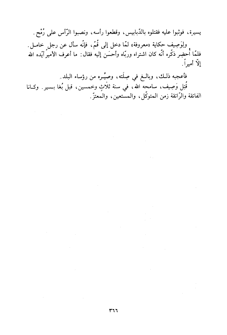 قُتِل وَصِيف، سامحه اللَّه، فِي سنة ثلَاثٍ وخمسين، قبل بُغَا بسير. وكانا الفاتقة والرّاتقة زمِنَ المتوكّلُ، والمستعين، والمعتزّ.