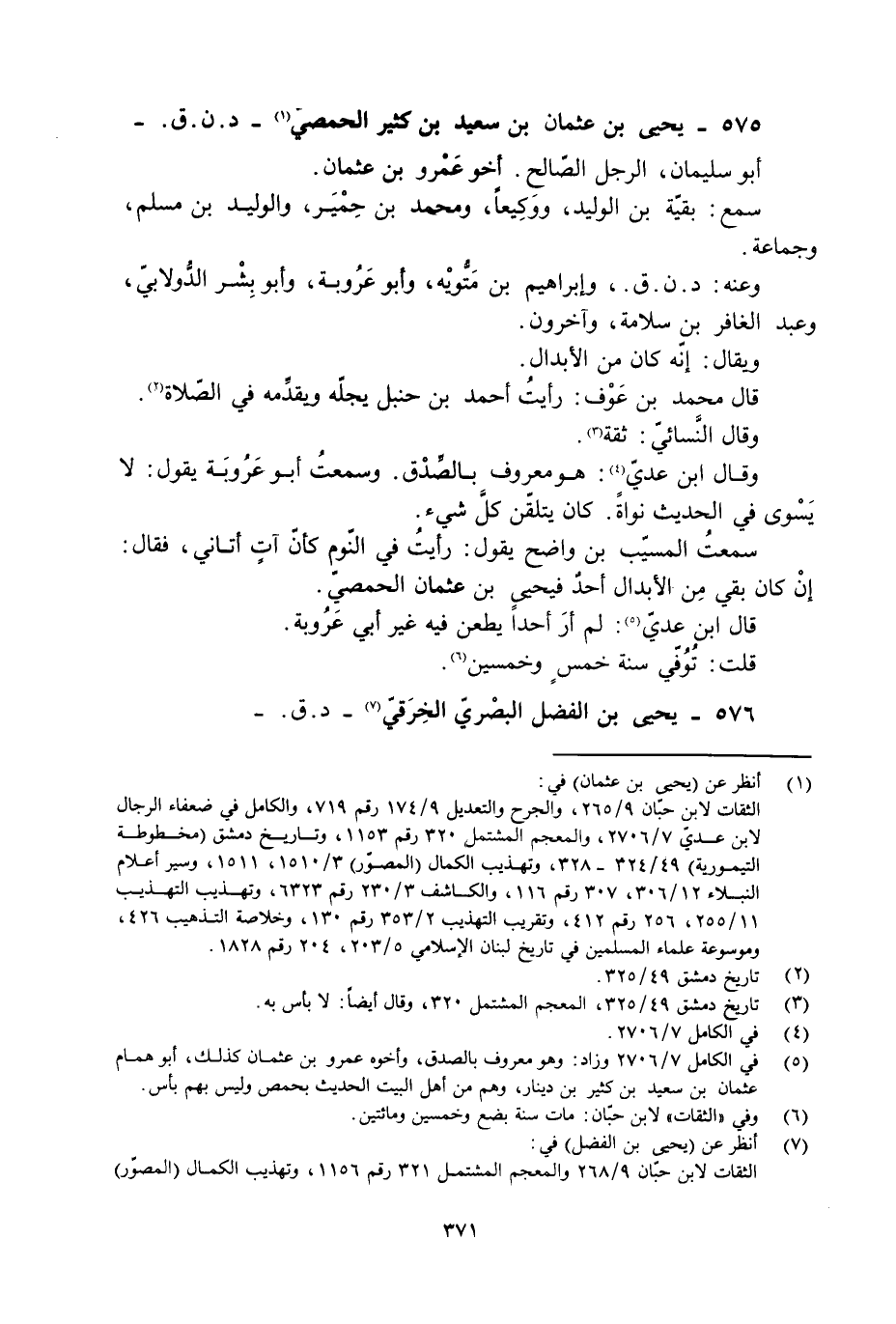 575- يحيى بْن عثمان بْن سعَيِد بْن كثير الحمصيّ [1]- د. ن. ق. - أبو سليمان، الرجل الصّالح. أخو عَمْرو بْن عثمان.
