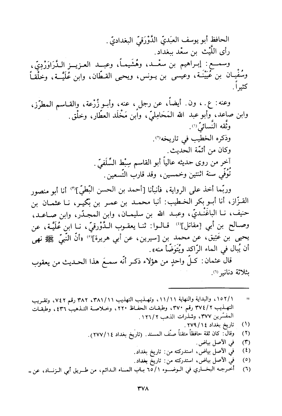 وَرُبَّمَا أَخَذَ عَلَى الرِّوَايَةِ، فَأَنْبَأَنَا [أَحْمَدُ بْنُ الْحَسَنِ الْبَطِّيُّ] [3] أَنَا أَبُو مَنْصُورٍ الْقَزَّازُ، أَنَا أَبُو بَكْرٍ الْخَطِيبُ: أَنْبَأَ محمد بْنُ عُمَرَ بْنِ بُكَيْرٍ، نَا عُثْمَانُ بْنُ حَنِيفٍ، نَا الْبَاغَنْدِيُّ، وَعَبْدُ اللَّهِ بْنُ سُلَيْمَانَ، وَابْنُ الْمُجَدِّرِ، وَابْنُ صَاعِدٍ، وَصَالِحُ بْنُ أَبِي [مُقَاتِلٍ] [4] قَالُوا: ثَنَا يَعْقُوبُ الدَّوْرَقِيُّ، نَا ابْنُ عُلَيَّةَ، عَنْ يَحْيَى بْنِ عَتِيقٍ، عَنْ محمد بْنِ [سِيرِينَ، عَنْ أَبِي هُرَيْرَةَ] [5] «أَنَّ النَّبِيَّ صَلَّى اللَّهُ عَلَيْهِ وَسَلَّمَ نَهَى أَنْ يُبَالَ فِي الْمَاءِ الرَّاكِدِ وَيُتَوَضَّأَ مِنْهُ» . قَالَ عُثْمَانُ: كُلُّ وَاحِدٍ مِنْ هَؤُلاءِ ذَكَرَ أَنَّهُ سَمِعَ هَذَا الحديث من يعقوب بثلاثة دنانير [6] .