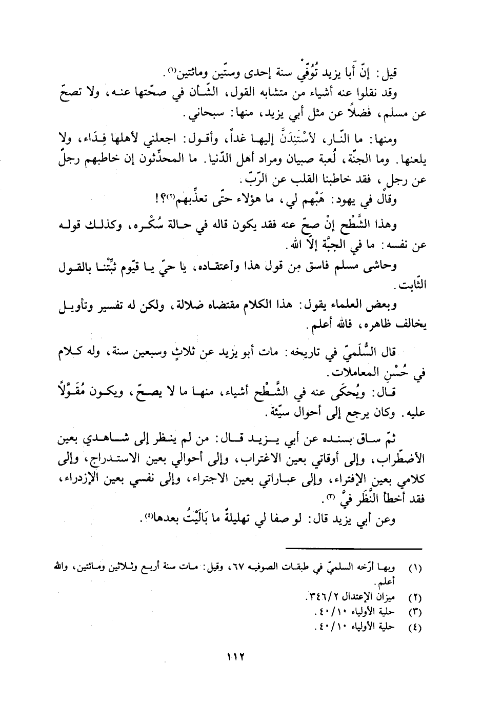 وقد نقلوا عَنْهُ أشياء من متشابه القول، الشّأن فِي صحّتها عَنْهُ، ولا تصحّ عن مُسْلِمٍ، فضلًا عن مثل أبي يزيد، منها: سبحاني.