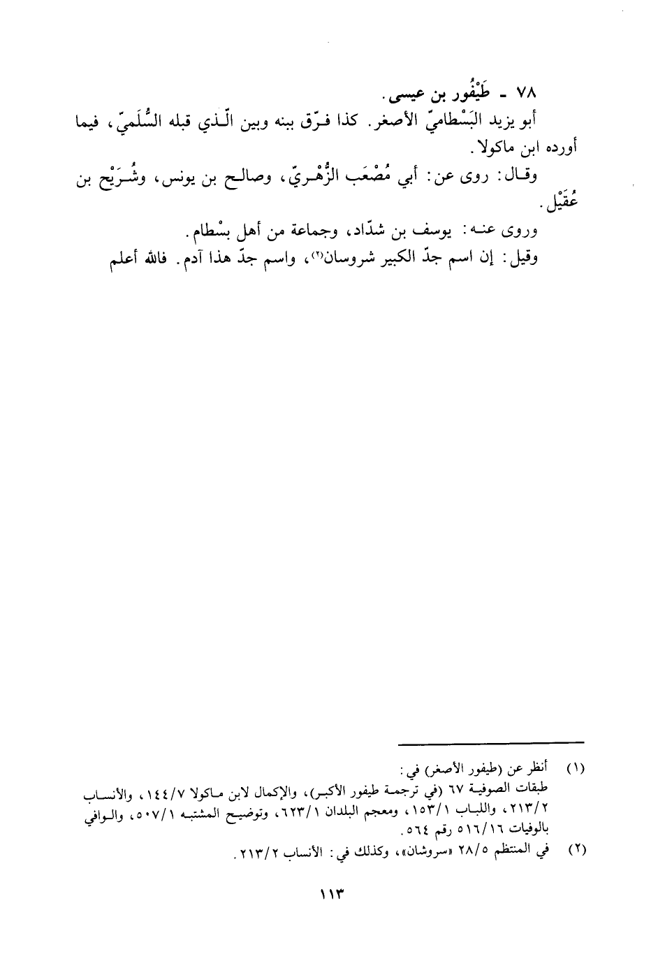 طبقات الصوفية 67 (في ترجمة طيفور الأكبر) ، والإكمال لابن ماكولا 7/ 144، والأنساب 2/ 213، واللباب 1/ 153، ومعجم البلدان 1/ 623، وتوضيح المشتبه 1/ 507، والوافي بالوفيات 16/ 516 رقم 564.